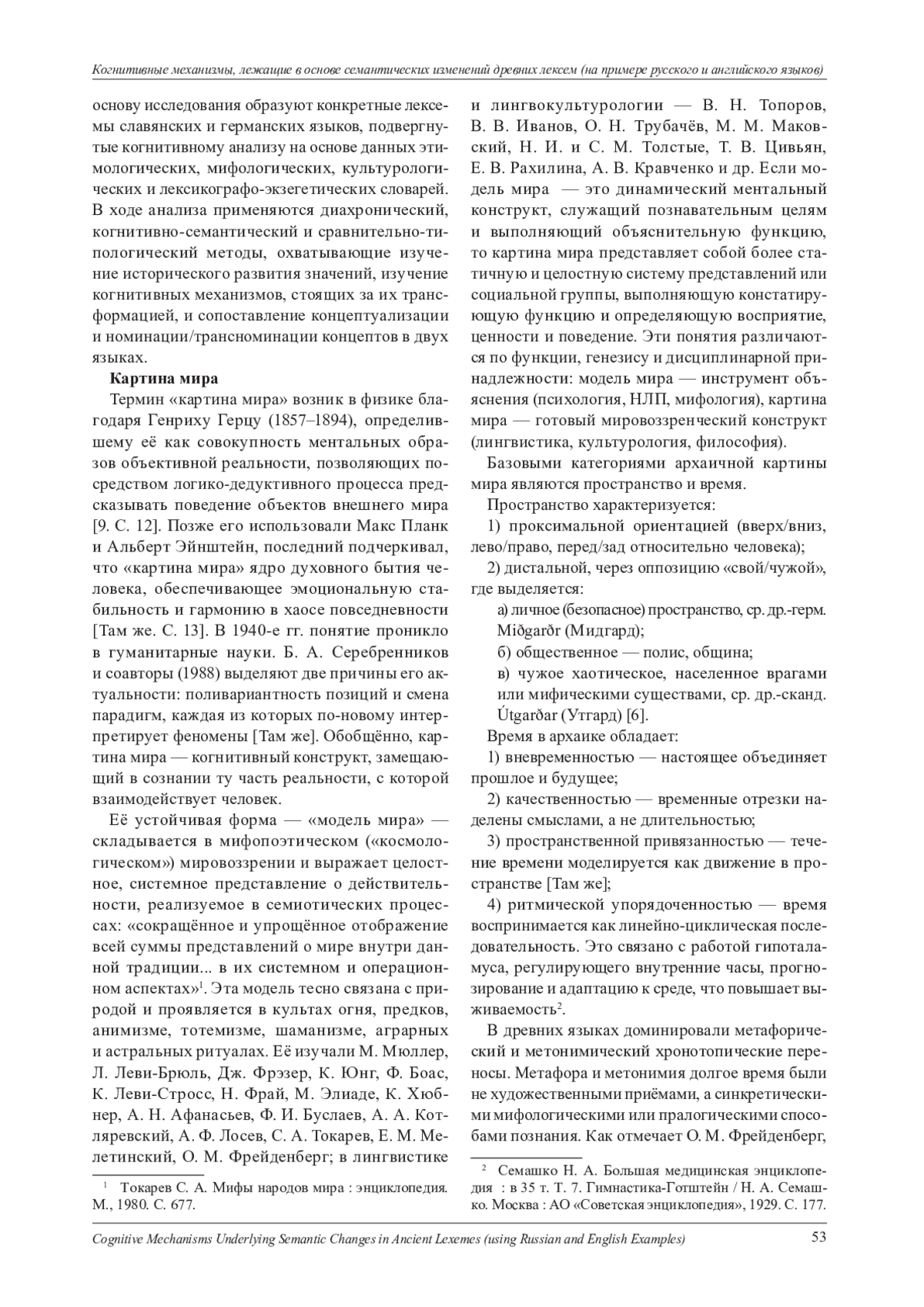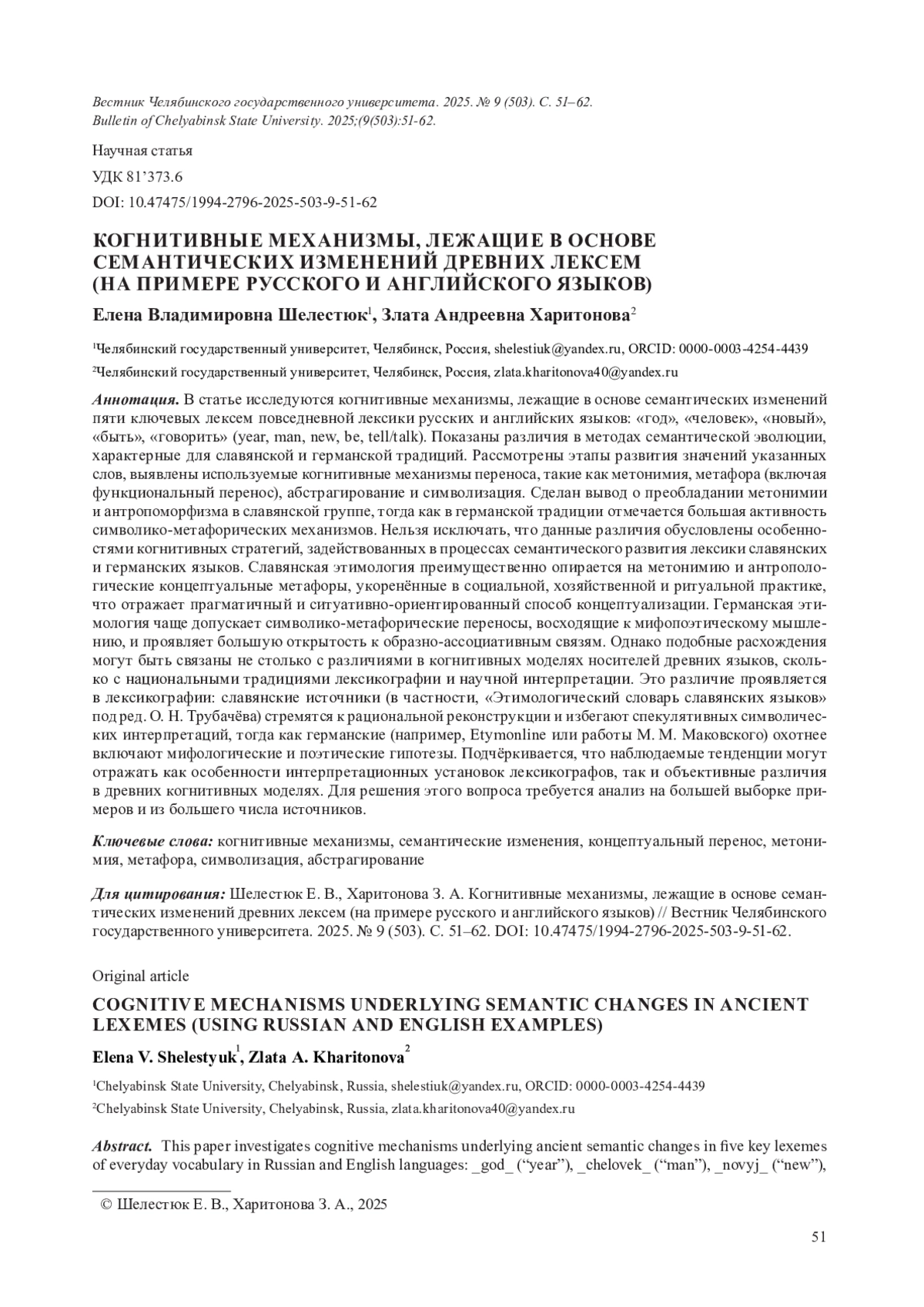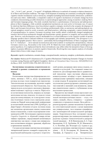 В статье исследуются когнитивные механизмы, лежащие в основе семантических изменений пяти ключевых лексем повседневной лексики русских и английских языков: «год», «человек», «новый», «быть», «говорить» (year, man, new, be, tell/talk). Показаны различия в методах семантической эволюции, характерные для славянской и германской традиций. Рассмотрены этапы развития значений указанных слов, выявлены используемые когнитивные механизмы переноса, такие как метонимия, метафора (включая функциональный перенос), абстрагирование и символизация. Сделан вывод о преобладании метонимии и антропоморфизма в славянской группе, тогда как в германской традиции отмечается большая активность символико-метафорических механизмов. Нельзя исключать, что данные различия обусловлены особенностями когнитивных стратегий, задействованных в процессах семантического развития лексики славянских и германских языков. Славянская этимология преимущественно опирается на метонимию и антропологические концептуальные метафоры, укоренённые в социальной, хозяйственной и ритуальной практике, что отражает прагматичный и ситуативно-ориентированный способ концептуализации. Германская этимология чаще допускает символико-метафорические переносы, восходящие к мифопоэтическому мышлению, и проявляет большую открытость к образно-ассоциативным связям. Однако подобные расхождения могут быть связаны не столько с различиями в когнитивных моделях носителей древних языков, сколько с национальными традициями лексикографии и научной интерпретации. Это различие проявляется в лексикографии: славянские источники (в частности, «Этимологический словарь славянских языков» под ред. О. Н. Трубачёва) стремятся к рациональной реконструкции и избегают спекулятивных символических интерпретаций, тогда как германские (например, Etymonline или работы М. М. Маковского) охотнее включают мифологические и поэтические гипотезы. Подчёркивается, что наблюдаемые тенденции могут отражать как особенности интерпретационных установок лексикографов, так и объективные различия в древних когнитивных моделях. Для решения этого вопроса требуется анализ на большей выборке примеров и из большего числа источников.