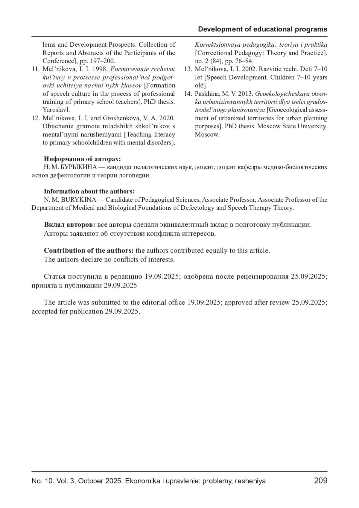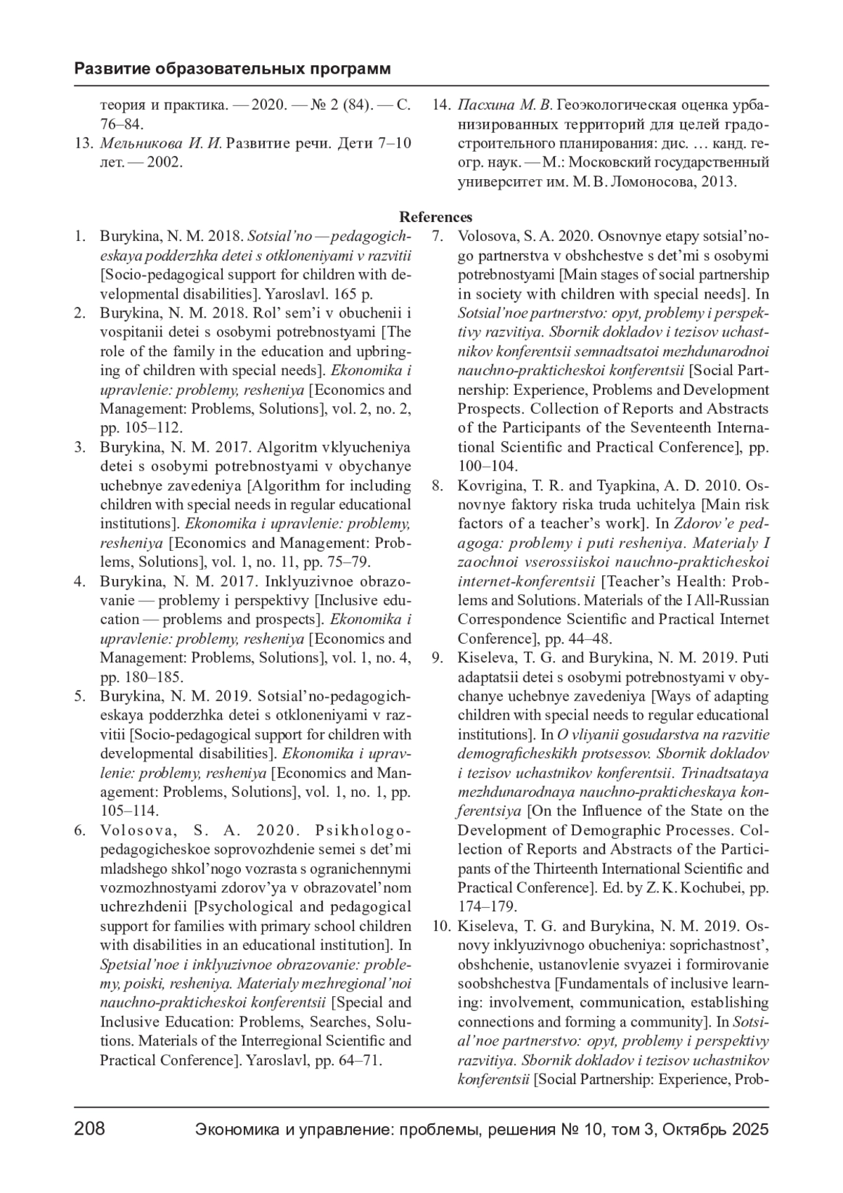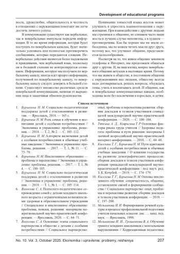 5. Бурыкина Н. М. Социально- педагогическая поддержка детей с отклонениями в развитии // Экономика и управление: проблемы, решения. - 2019. - Т. 1, № 1. - С. 105-114. EDN: YYFWLZ