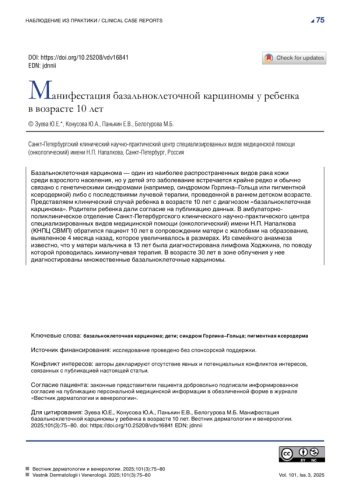Базальноклеточная карцинома — один из наиболее распространенных видов рака кожи среди взрослого населения, но у детей это заболевание встречается крайне редко и обычно связано с генетическими синдромами (например, синдромом Горлина–Гольца или пигментной ксеродермой) либо с последствиями лучевой терапии, проведенной в раннем детском возрасте. Представляем клинический случай ребенка в возрасте 10 лет с диагнозом «базальноклеточная карцинома». Родители ребенка дали согласие на публикацию данных. В амбулаторнополиклиническое отделение Санкт-Петербургского клинического научно-практического центра специализированных видов медицинской помощи (онкологический) имени Н. П. Напалкова (КНПЦ СВМП) обратился пациент 10 лет в сопровождении матери с жалобами на образование, выявленное 4 месяца назад, которое увеличивалось в размерах. Из семейного анамнеза известно, что у матери мальчика в 13 лет была диагностирована лимфома Ходжкина, по поводу которой проводилась химиолучевая терапия. В возрасте 30 лет в зоне облучения у нее диагностированы множественные базальноклеточные карциномы.