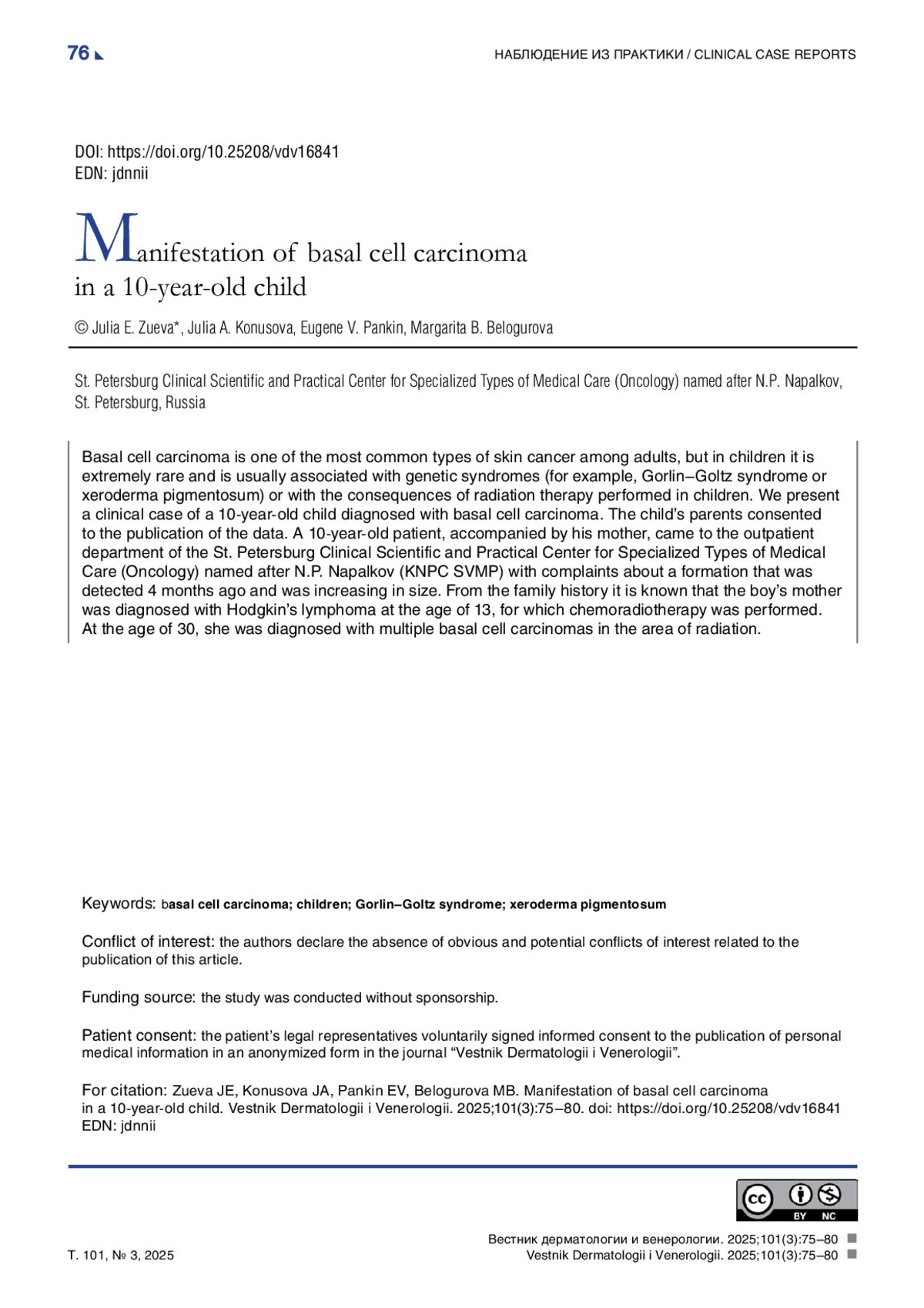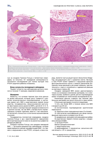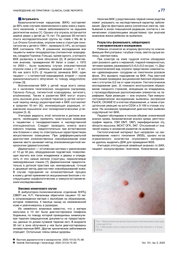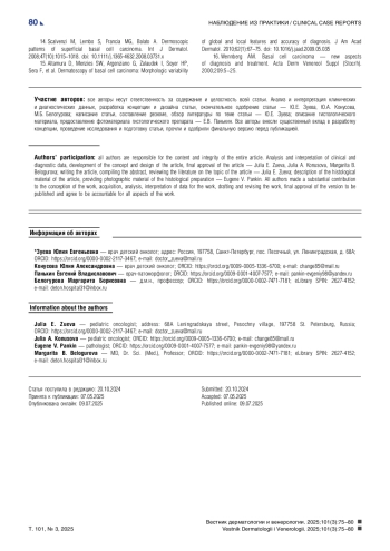 Базальноклеточная карцинома (БКК) составляет до 80% всех случаев немеланомного рака кожи у взрослого населения, с пиком заболеваемости на седьмом десятилетии жизни [1]. Однако эта опухоль встречается крайне редко у детей до 15 лет. По данным 20-летнего опыта исследовательской группы во главе с Ma de la Luz Orozco-Covarrubias, опухоли кожи в структуре онкопатологии у детей в 1994 г. занимали 0,14%, из которых БКК составила 13%. В указанном исследовании все пациенты имели генодерматозы (пигментная ксеродерма, синдром Горлина–Гольца), кроме одного, у которого БКК развилась в зоне облучения [2]. В ретроспективном анализе, проведенном Alİ Varan и соавт. с 1972 по 2003 г., были выявлены случаи злокачественной опухоли кожи у 21 ребенка, средний возраст — 9 лет. Из них всего 9,5% (2 пациента) занимала БКК: один пациент — с пигментной ксеродермой, второй — после краниоспинального облучения по поводу медуллобластомы [3].