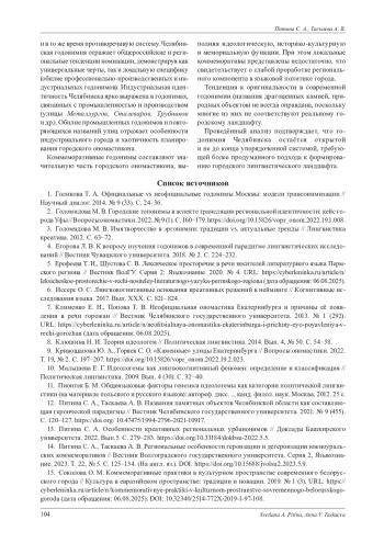 13. Питина С. А. Особенности креативных региональных урбанонимов // Доклады Башкирского университета. 2022. Вып.5. С. 279-283. DOI: 10.33184/dokbsu-2022.5.5 EDN: RYLQWI