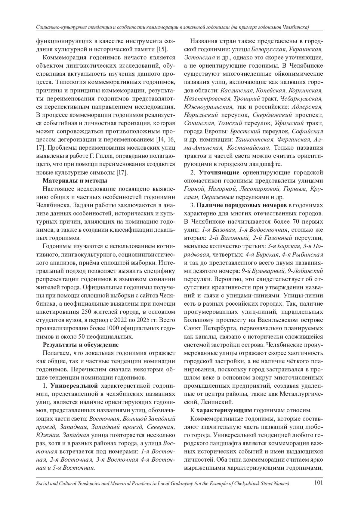 В работе рассматриваются особенности локальной годонимии на материале названий улиц города Челябинска. Лингвистический ландшафт города формируется под влиянием целого ряда процессов: исторических, культурных, идеологических, включающих в себя как общие тенденции номинации, с одной стороны, так и особенности, характерные для конкретного городского ономастикона, с другой. Авторами предложена типология челябинских годонимов, учитывающая не только предложенное Т. В. Шмелёвой деление названий на характеризующие и ориентирующие, но и наличие обобщающих и конкретизирующих годонимов. В статье используется интегральный подход к анализу локальных годонимов. Отмечается отсутствие их переименования в современном периоде даже при наличии не совсем оправданных, благозвучных и повторяющихся названий. Выявлена тенденция к распространению в городском ономастиконе разнообразной годонимической тематики, не всегда соответствующей реальному городскому ландшафту, что свидетельствует о необходимости совершенствования языковой политики в данном направлении. Коммеморативные годонимы рассматриваются авторами как героические идеологемы в открытой героической парадигме. Выделяются обобщающие и личностные коммеморативные годонимы. Тенденции коммеморации годонимов и их переименования характерны для периода формирования и переосмысления культурных ценностей и сохранения исторической памяти. Переименование коммеморативных годонимов происходит достаточно редко, в то время как коммеморация исторических событий и имен выдающихся личностей является частотной в челябинском ономастиконе. Локальные коммеморативные годонимы отражают общие для всех языков и культур тенденции коммеморации в честь событий и известных людей. Появление локальных коммеморативов обусловлено вкладом города в формирование героической парадигмы, включающей коммеморацию местных писателей, промышленников, героев войн, учёных.
