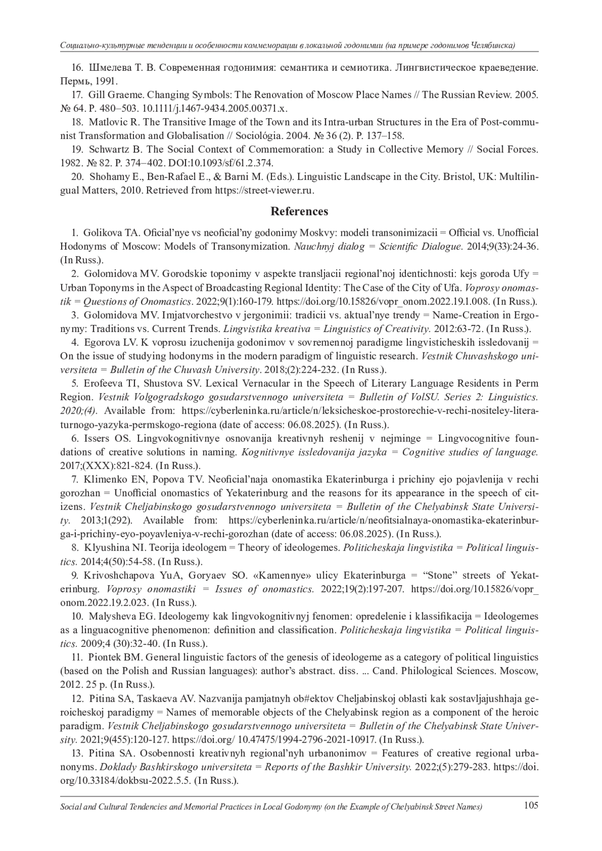 2. Голомидова М. В. Городские топонимы в аспекте трансляции региональной идентичности: кейс города Уфы // Вопросы ономастики. 2022. № 9 (1). С. 160-179. DOI: 10.15826/vopr_onom.2022.19.1.008 EDN: IIWCTG