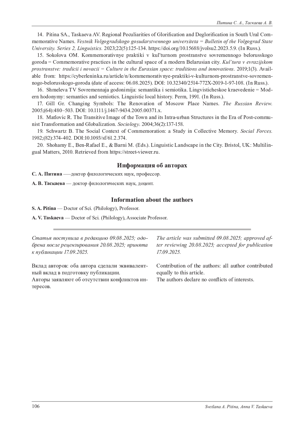 14. Питина С. А., Таскаева А. В. Региональные особенности героизации и дегероизации южноуральских коммеморативов // Вестник Волгоградского государственного университета. Серия 2, Языкознание. 2023. Т. 22, № 5. С. 125-134. (На англ. яз.). DOI: 10.15688/jvolsu2.2023.5.9 EDN: GHMVFJ