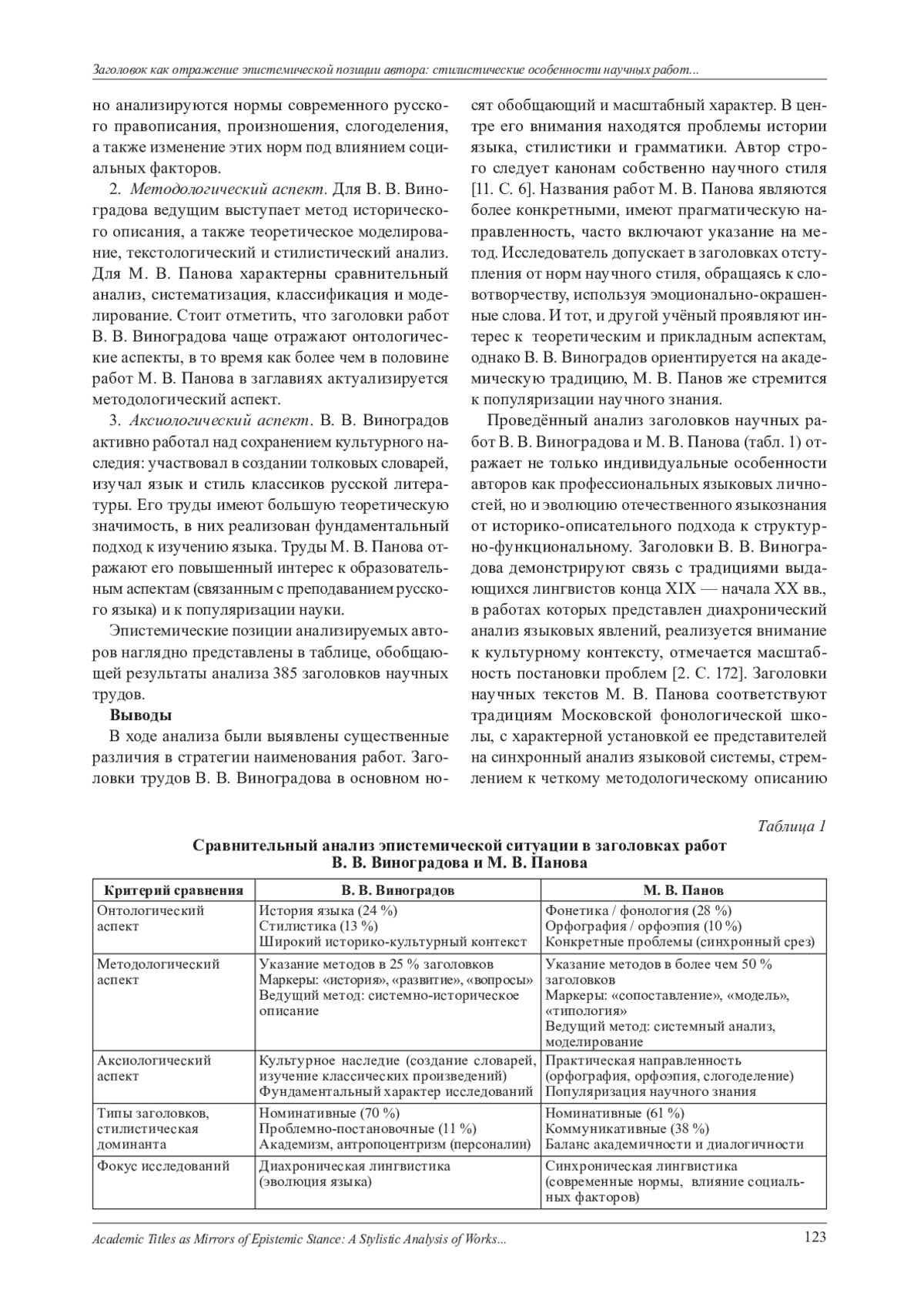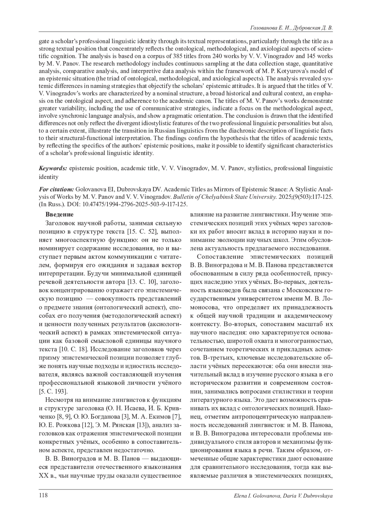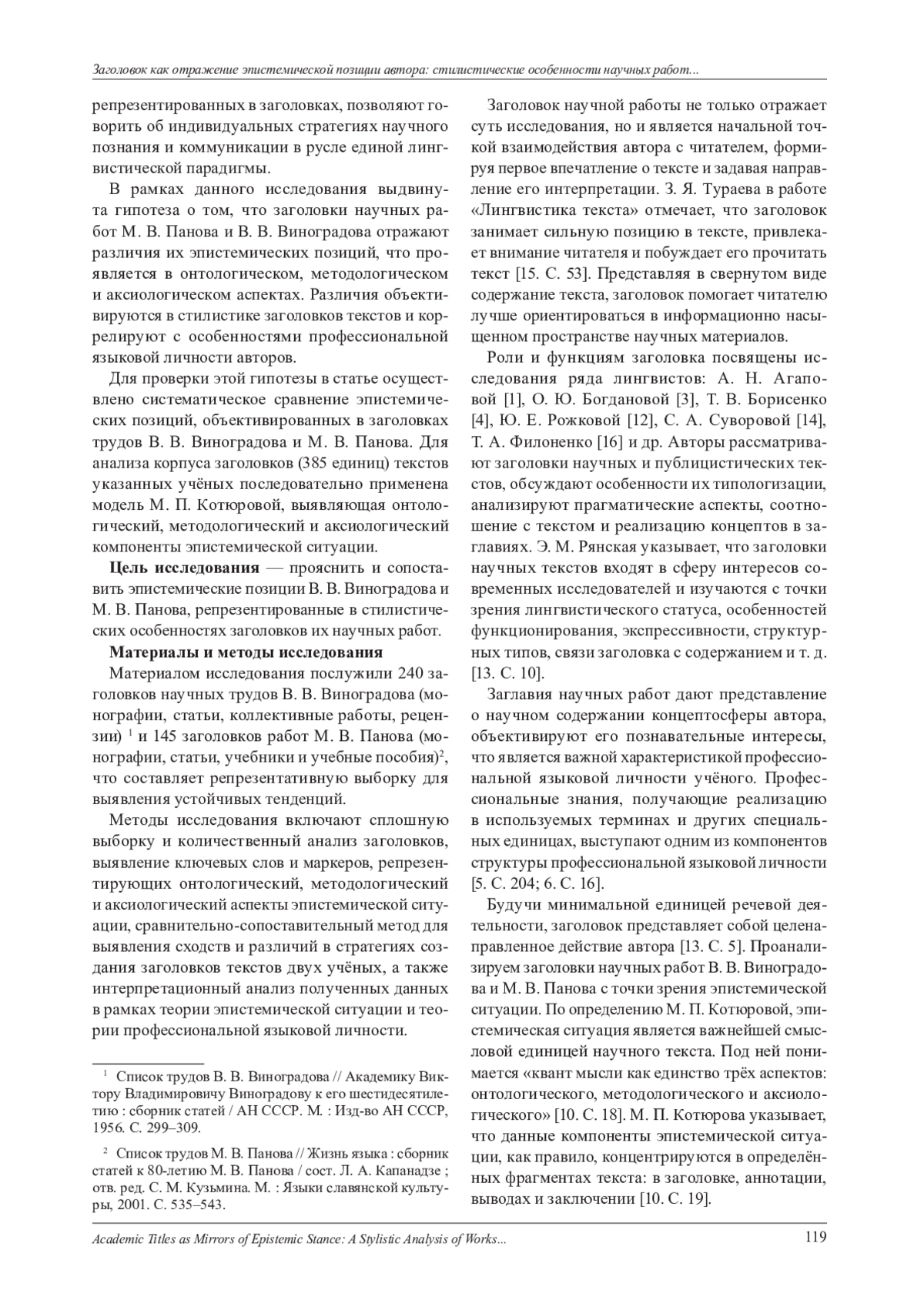 Статья посвящена анализу заголовков научных работ двух выдающихся отечественных лингвистов с точки зрения отражения в них эпистемических позиций авторов. Актуальность исследования обусловлена необходимостью изучения профессиональной языковой личности учёного через её текстовые репрезентации, в частности, через заголовок как сильную позицию текста, концентрированно отражающую онтологические, методологические и аксиологические аспекты научного познания. Материалом для анализа послужил корпус из 385 заголовков к 240 работам В. В. Виноградова и 145 работам М. В. Панова. Методология исследования включает сплошную выборку на этапе сбора материала, его количественный анализ, сравнительно-сопоставительный метод и интерпретационный анализ данных в рамках модели эпистемической ситуации М. П. Котюровой (триединство онтологического, методологического и аксиологического аспектов). В результате проведённого анализа выявлены системные различия в стратегиях наименования, объективирующие эпистемические установки учёных. Утверждается, что для заголовков работ В. В. Виноградова характерны номинативность, широкий историко-культурный контекст, акцент на онтологический аспект и следование академическому канону. Заголовки работ М. В. Панова демонстрируют большую вариативность, включая реализацию коммуникативных стратегий, указывают на методологический аспект, синхронный анализ языка и прагматическую направленность. Делается вывод, что выявленные различия не только отражают несовпадение идиостилевых черт двух профессиональных языковых личностей, но и в определённой мере иллюстрируют переход отечественного языкознания от диахронного описания языковых фактов к структурно-функциональному их осмыслению. Выводы подтверждают гипотезу о том, что заголовки научных текстов, отражая особенности эпистемической позиции авторов, позволяют выявлять значимые характеристики профессиональной языковой личности ученого.