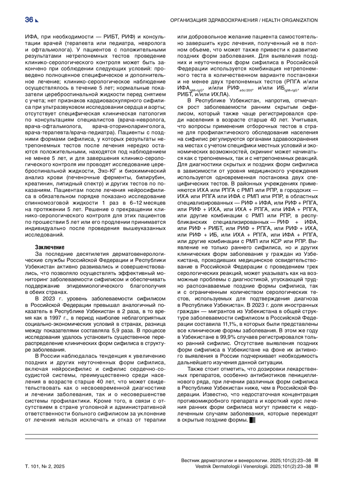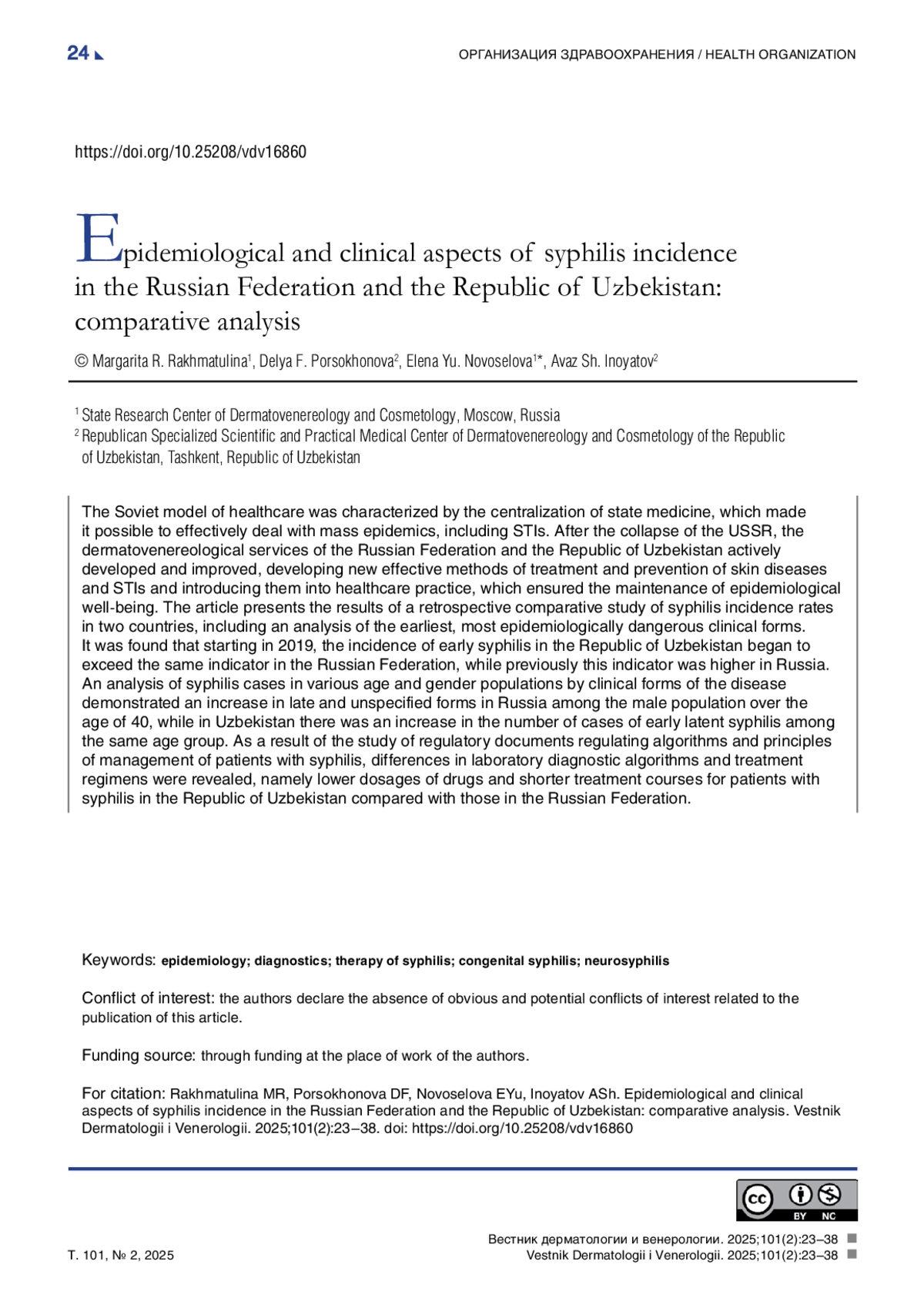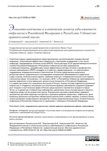 Советская модель здравоохранения характеризовалась централизацией государственной медицины, позволяющей эффективно справляться с массовыми эпидемиями, в том числе инфекций, передаваемых половым путем (ИППП). После распада СССР дерматовенерологические службы Российской Федерации и Республики Узбекистан активно развивались и совершенствовались, разрабатывая новые эффективные методы лечения и профилактики кожных заболеваний и ИППП и внедряя их в практику здравоохранения, что обеспечивало поддержание эпидемиологического благополучия. В статье представлены результаты ретроспективного сравнительного исследования показателей заболеваемости сифилисом в двух странах, включая анализ ранних, наиболее опасных с эпидемиологической точки зрения клинических форм. Установлено, что начиная с 2019 г. в Республике Узбекистан заболеваемость ранним сифилисом стала превышать аналогичный показатель в Российской Федерации, в то время как ранее этот показатель был выше в России. Анализ случаев сифилиса в различных возрастных и гендерных популяциях по клиническим формам заболевания продемонстрировал рост поздних и неуточненных форм в России среди мужского населения в возрасте старше 40 лет, в то время как в Узбекистане наблюдалось увеличение числа случаев раннего скрытого сифилиса среди той же возрастной группы. В результате изучения нормативных правовых документов, регламентирующих алгоритмы и принципы ведения пациентов с сифилисом, были выявлены различия в алгоритмах лабораторной диагностики и схемах терапии, а именно более низкие дозировки лекарственных препаратов и менее продолжительные курсы лечения больных сифилисом в Республике Узбекистан по сравнению с таковыми в Российской Федерации.