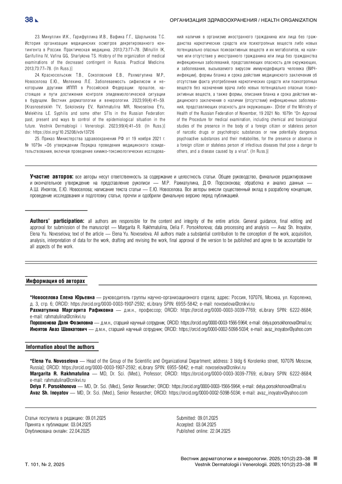 24. Красносельских Т.В., Соколовский Е.В., Рахматулина М.Р., Новоселова Е.Ю., Мелехина Л.Е. Заболеваемость сифилисом и некоторыми другими ИППП в Российской Федерации: прошлое, настоящее и пути достижения контроля эпидемиологической ситуации в будущем. Вестник дерматологии и венерологии. 2023;99(4):41-59. DOI: 10.25208/vdv13726