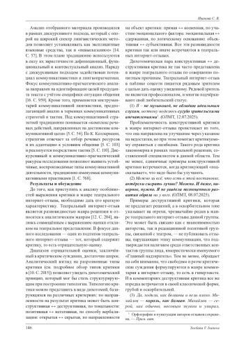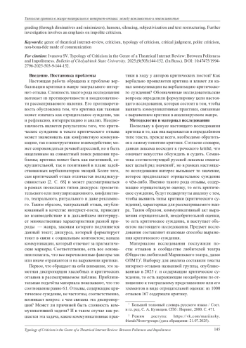 Настоящая работа обращена к проблеме вербализации критики в жанре театрального интернет-отзыва. Сложность такого рода исследования вытекает из противоречивости и неоднозначности рассматриваемого явления. Его противоречивость обусловлена тем, что критика как таковая может означать как отрицательное суждение, так и рефлексию, интерпретацию и анализ. Неоднозначность является результатом того, что критическое суждение в тексте критического отзыва может знаменовать как конфликтную коммуникацию, так и конструктивное взаимодействие; может сопровождаться речевой агрессией, но и быть нацеленным на совместный поиск решения проблемы; критика может быть как негативной, сокрушительной, так и позитивной в плане задействованных вербализаторов эмоций. Более того, сам критический отзыв отличается полидискурсивностью [2. С. 68] и может рассматриваться в рамках нескольких типов дискурса: просветительского или популяризационного, конфликтного, театрального, ритуального и даже рекламного.