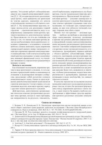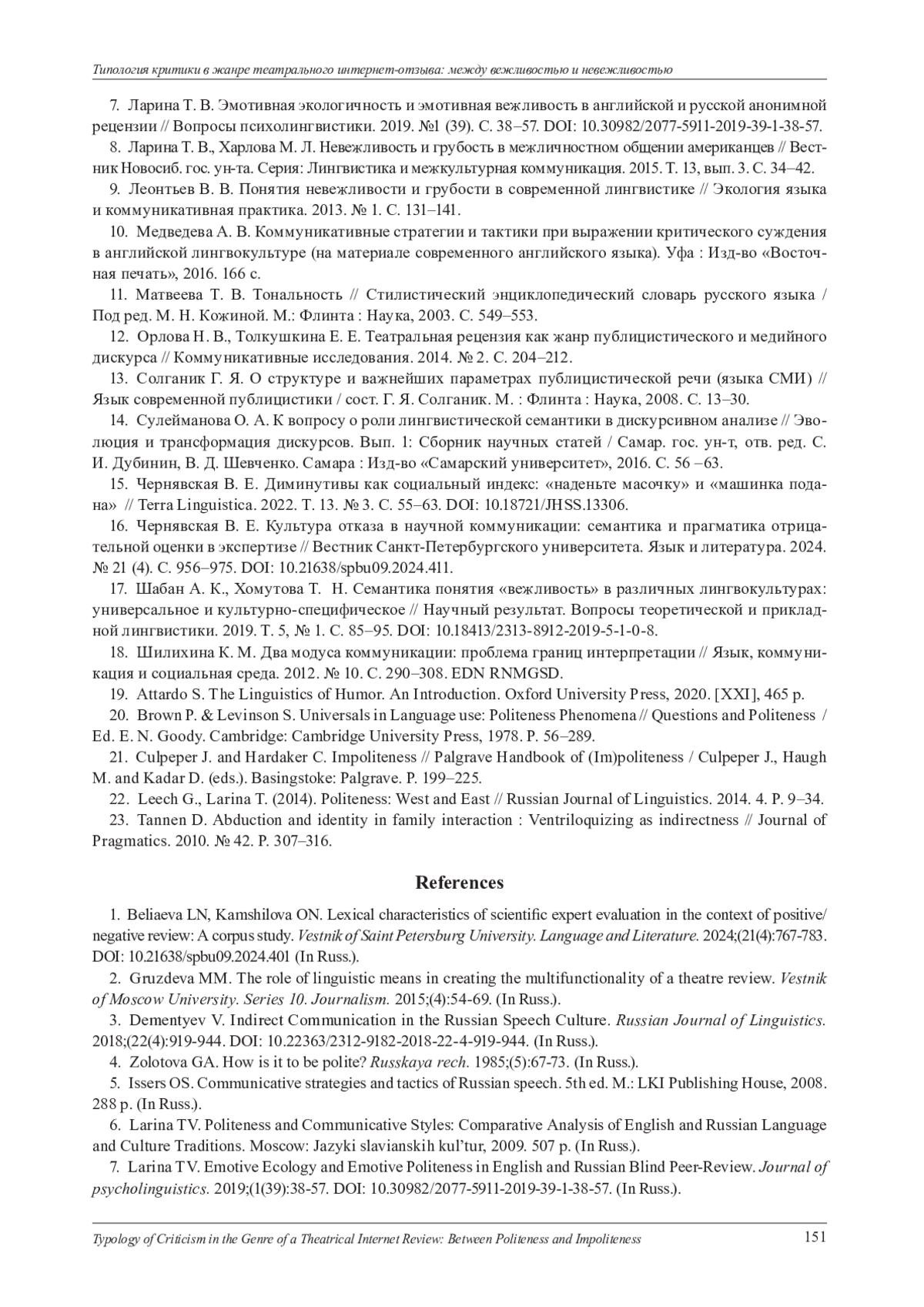 7. Ларина Т. В. Эмотивная экологичность и эмотивная вежливость в английской и русской анонимной рецензии // Вопросы психолингвистики. 2019. №1 (39). С. 38-57. DOI: 10.30982/2077-5911-2019-39-1-38-57 EDN: ZAYJBR