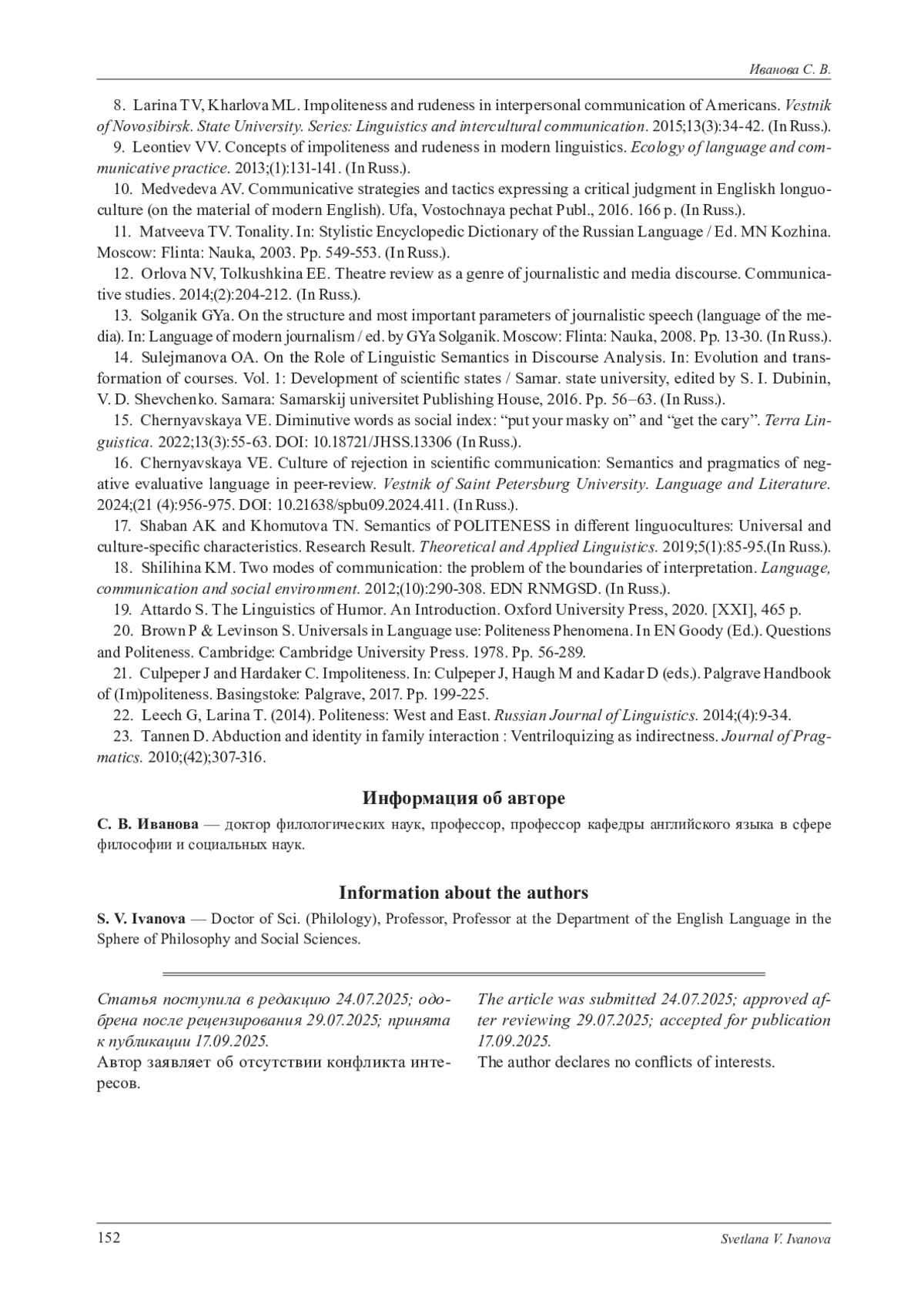 8. Ларина Т. В., Харлова М. Л. Невежливость и грубость в межличностном общении американцев // Вестник Новосиб. гос. ун-та. Серия: Лингвистика и межкультурная коммуникация. 2015. Т. 13, вып. 3. С. 34-42.