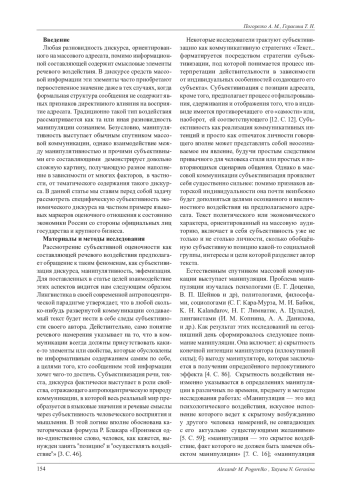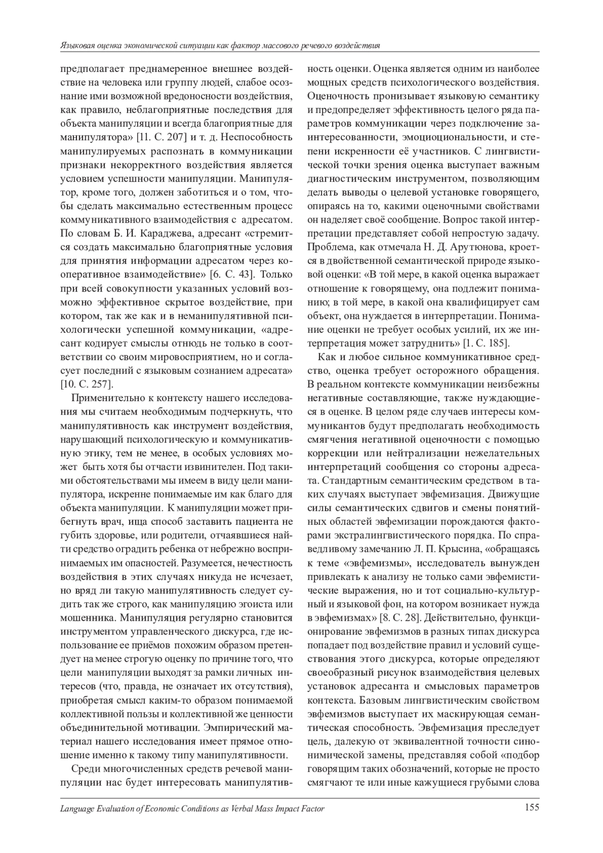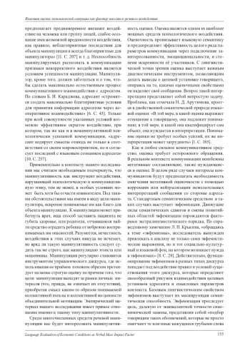 Любая разновидность дискурса, ориентированного на массового адресата, помимо информационной составляющей содержит смысловые элементы речевого воздействия. В дискурсе средств массовой информации эти элементы часто приобретают первостепенное значение даже в тех случаях, когда формальная структура сообщения не содержит явных признаков директивного влияния на восприятие адресата. Традиционно такой тип воздействия рассматривается как та или иная разновидность манипуляции сознанием. Безусловно, манипулятивность выступает обычным спутником массовой коммуникации, однако взаимодействие между манипулятивностью и прочими субъективными его составляющими демонстрирует довольно сложную картину, получающую разное наполнение в зависимости от многих факторов, в частности, от тематического содержания такого дискурса. В данной статье мы ставим перед собой задачу рассмотреть специфическую субъективность экономического дискурса на частном примере языковых маркеров оценочного отношения к состоянию экономики России со стороны официальных лиц государства и крупного бизнеса.