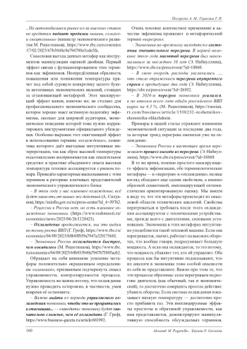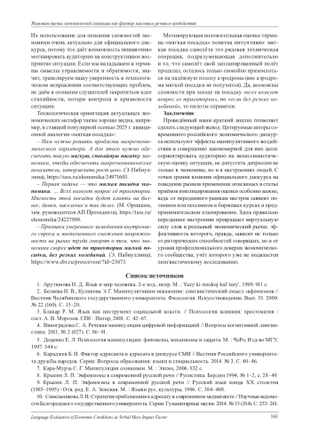Статья посвящена изучению приёмов психологического воздействия на широкий круг адресантов экономического дискурса. Исследование проведено на основе анализа языковых маркеров оценочного отношения к состоянию экономики России со стороны официальных лиц государства и крупного бизнеса. В эмпирической части цель работы состоит в том, чтобы определить, в каком отношении речевые приёмы в официальном экономическим дискурсе могут претендовать на роль психологических средств воздействия на целевую аудиторию через формирование и корректирование оценки экономических явлений. Материал исследования представлен высказываниями ключевых представителей экономического управленческого дискурса, описывающих состояние российской экономики в 2024-2025 гг. В центре нашего внимания находятся лексические средства выражения оценки, применяемые этими авторами в качестве инструментов формирования образа актуальной экономической реальности, соответствующего целям конструктивно-мотивирующего воздействия на массовую и профессиональную аудиторию.