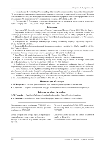 11. Слама-Казаку Т. For the Right Understanding of the Term Manipulation and the Study of the Related Reality / К правильному пониманию термина “манипуляция” и изучению относительной реальности // Вопросы психолингвистики. Изд-во: Негосударственное образовательное учреждение высшего профессионального образования “Московский институт лингвистики” (Москва). 2010. № 12. С. 206-209. EDN: PYZMHV