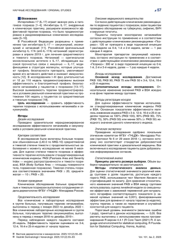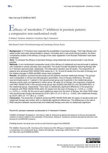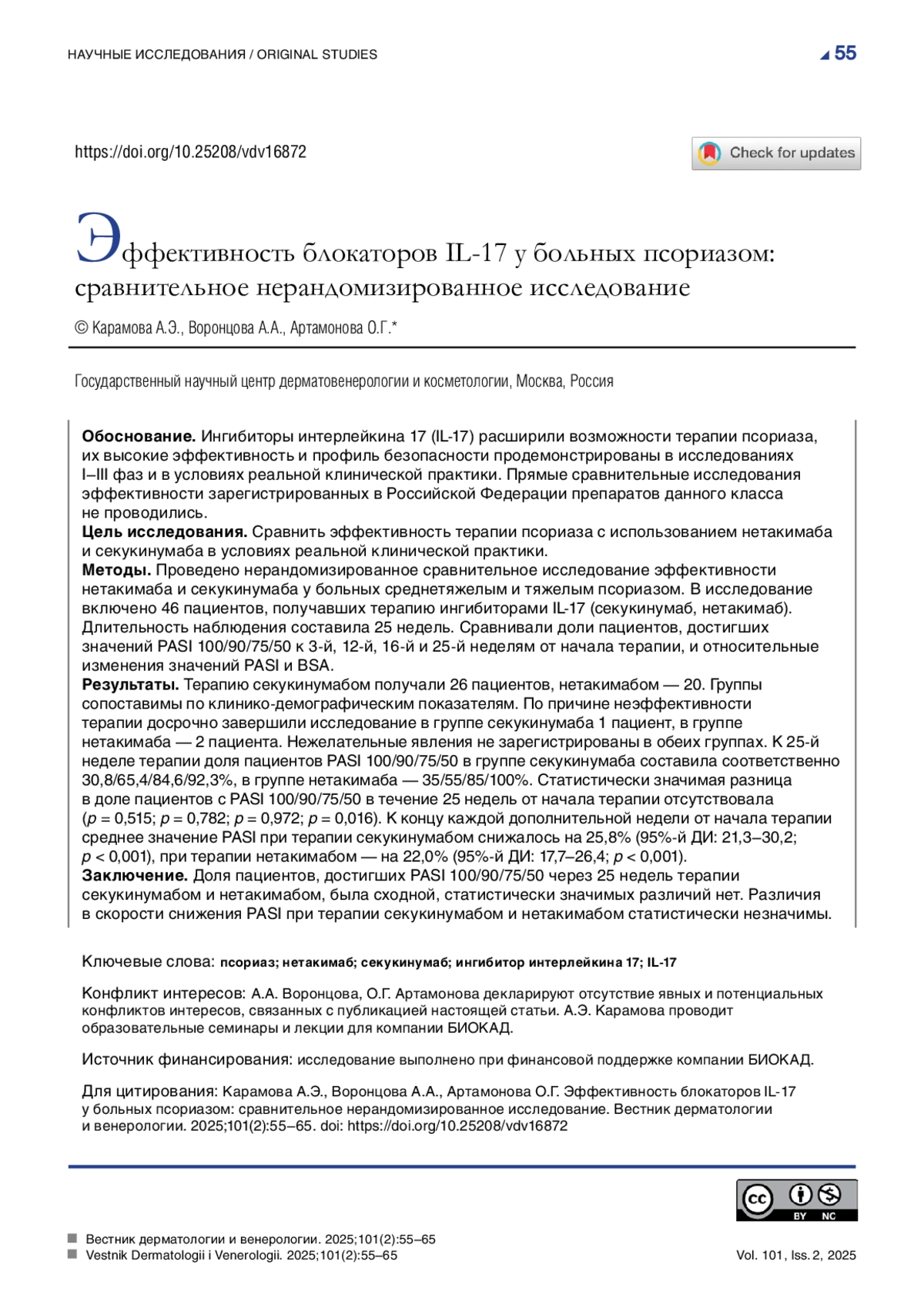Интерлейкин-17 (IL-17) играет важную роль в патогенезе псориаза [1–4]. Ингибиторы IL-17, внедренные в клиническую практику, расширили возможности эффективной терапии псориаза, что было продемонстрировано в рандомизированных клинических исследованиях [5–10].