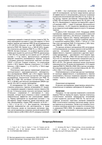 21. Олисова О.Ю., Никурадзе В.О. Эффективность секукинумаба при лечении пациентов с тяжелым псориазом. Эффективная фармакотерапия. 2020;16(9):6-10. DOI: 10.33978/2307-3586-2020-16-9-6-10