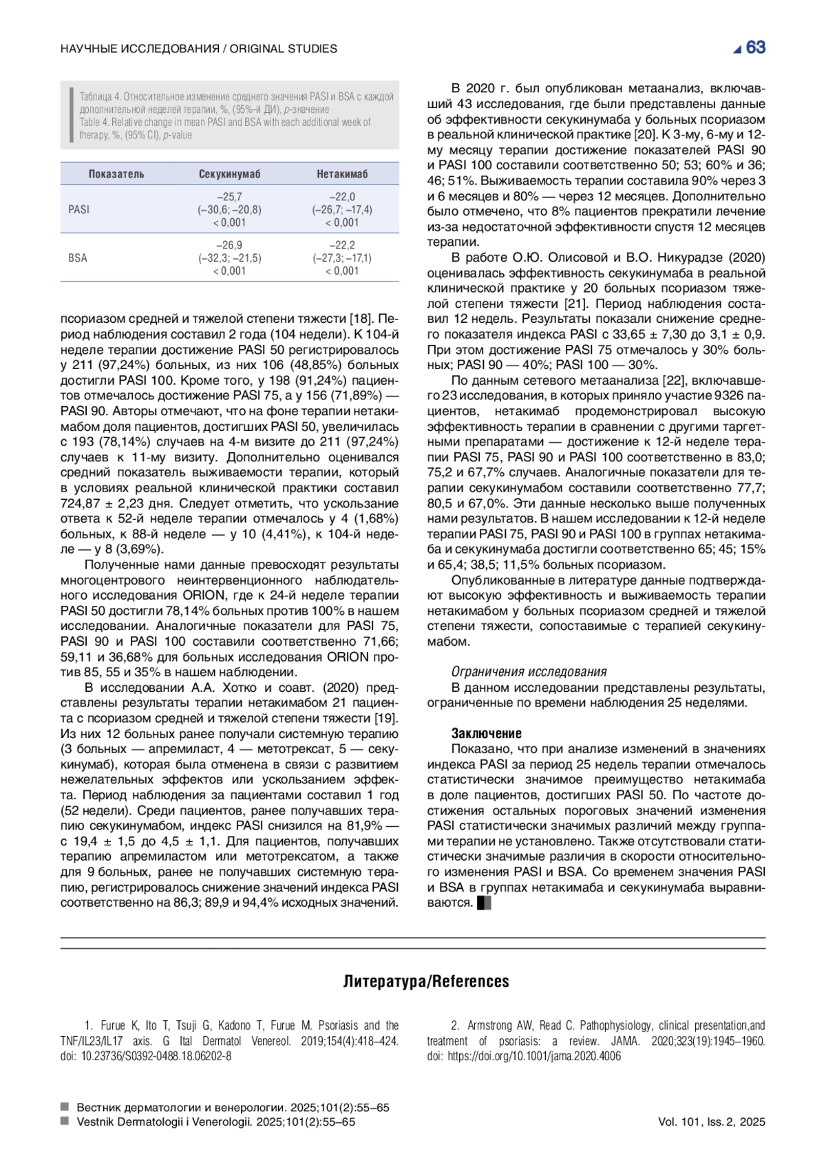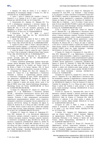 18. Бакулев А.Л., Притуло О.А., Кунцевич Ж.С., Хотко А.А., Юновидова А.А., Городничев П.В., и др. Эффективность и безопасность терапии нетакимабом у пациентов со среднетяжелым и тяжелым псориазом в реальной клинической практике. Вестник дерматологии и венерологии. 2023;99(5):84-95. DOI: 10.25208/vdv14864
