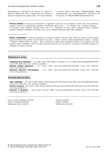 14. Бакулев А.Л., Самцов А.В., Кубанов А.А., Хайрутдинов В.Р., Кохан М.М., Артемьева А.В., и др. Долгосрочная эффективность и безопасность препарата нетакимаб у пациентов со среднетяжелым и тяжелым вульгарным псориазом. Результаты открытого продленного клинического исследования II фазы BCD-085-2-ext. Вестник дерматологии и венерологии. 2019;95(3):54-64. DOI: 10.25208/0042-4609-2019-95-3-54-64