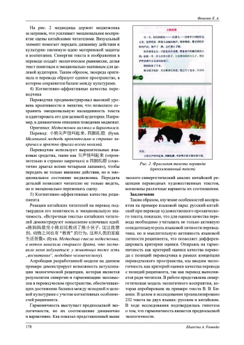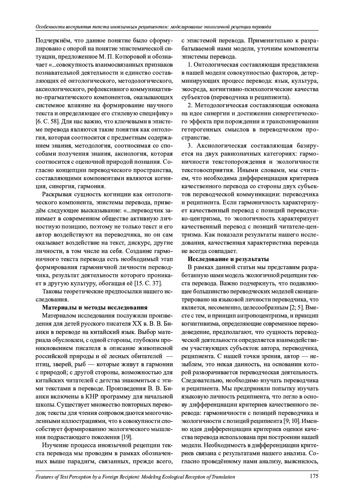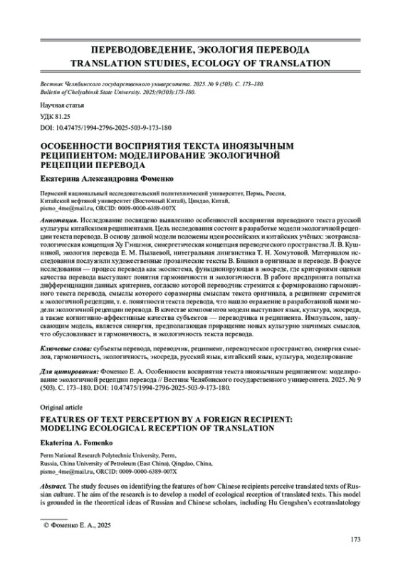 Исследование посвящено выявлению особенностей восприятия переводного текста русской культуры китайскими реципиентами. Цель исследования состоит в разработке модели экологичной рецепции текста перевода. В основу данной модели положены идеи российских и китайских учёных: экотранслатологическая концепция Ху Гэншэня, синергетическая концепция переводческого пространства Л. В. Кушниной, экология перевода Е. М. Пылаевой, интегральная лингвистика Т. Н. Хомутовой. Материалом исследования послужили художественные прозаические тексты В. Бианки в оригинале и переводе. В фокусе исследования - процесс перевода как экосистема, функционирующая в экосреде, где критериями оценки качества перевода выступают понятия гармоничности и экологичности. В работе предпринята попытка дифференциации данных критериев, согласно которой переводчик стремится к формированию гармоничного текста перевода, смыслы которого соразмерны смыслам текста оригинала, а реципиент стремится к экологичной рецепции, т. е. понятности текста перевода, что нашло отражение в разработанной нами модели экологичной рецепции перевода. В качестве компонентов модели выступают язык, культура, экосреда, а также когнитивно-аффективные качества субъектов - переводчика и реципиента. Импульсом, запускающим модель, является синергия, предполагающая приращение новых культурно значимых смыслов, что обусловливает и гармоничность, и экологичность текста перевода.