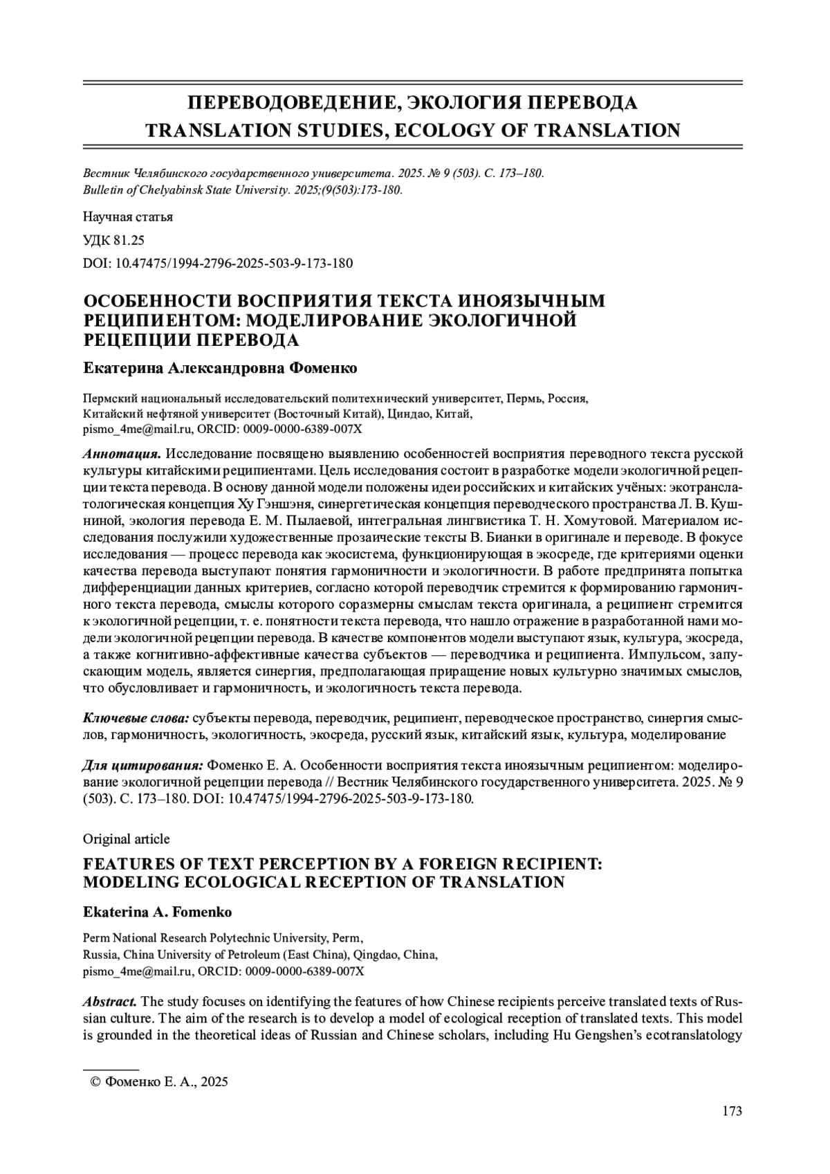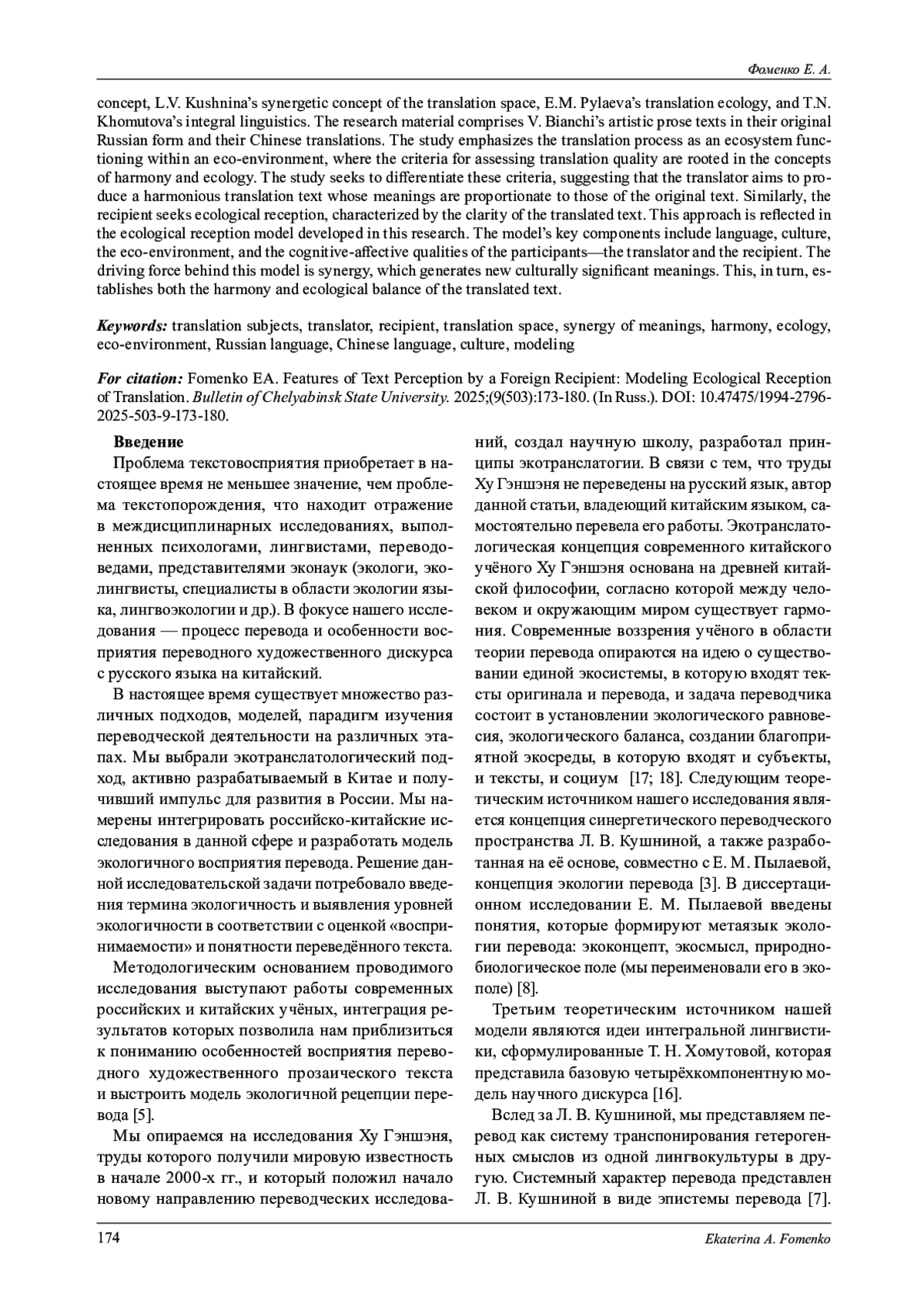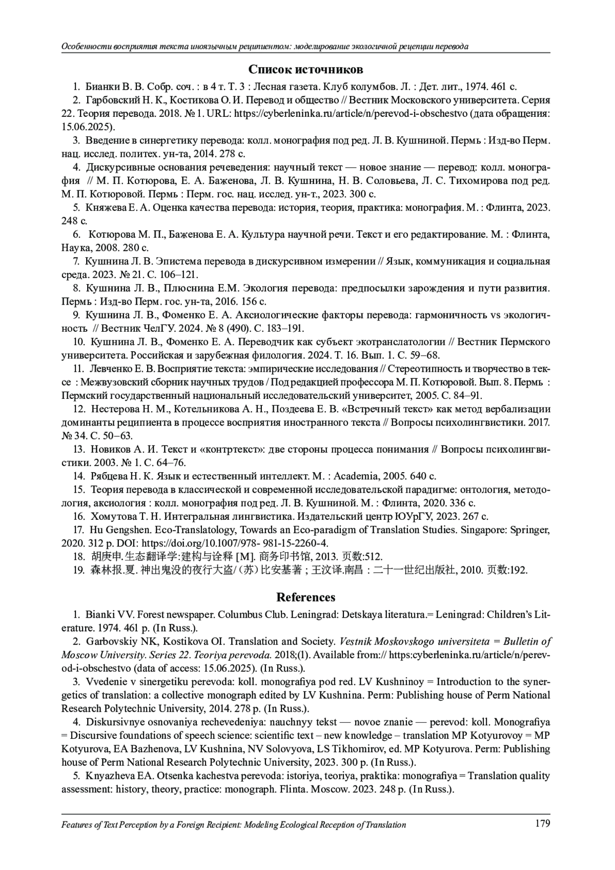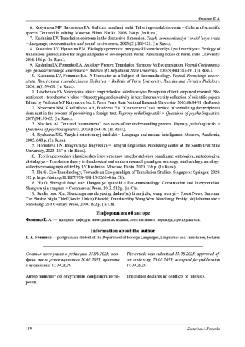 9. Кушнина Л. В., Фоменко Е. А. Аксиологические факторы перевода: гармоничность vs экологичность // Вестник ЧелГУ. 2024. № 8 (490). С. 183-191.