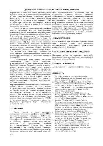 6. Bai S., Yang T., Abbruscato T.J., Ahsan F. (2008) Evaluation of human nasal RPMI 2650 cells grown at an air-liquid interface as a model for nasal drug transport studies. J. Pharm. Sci., 97(3), 1165-1178. DOI: 10.1002/jps.21031