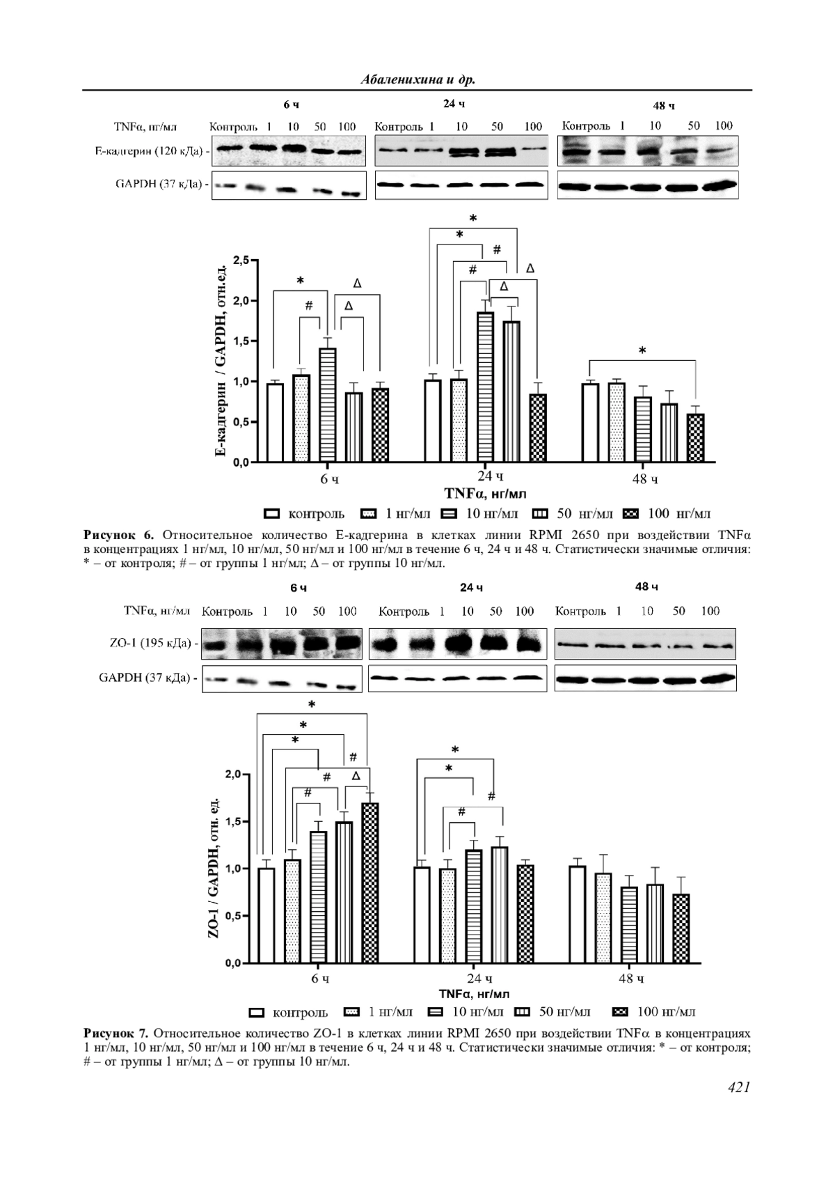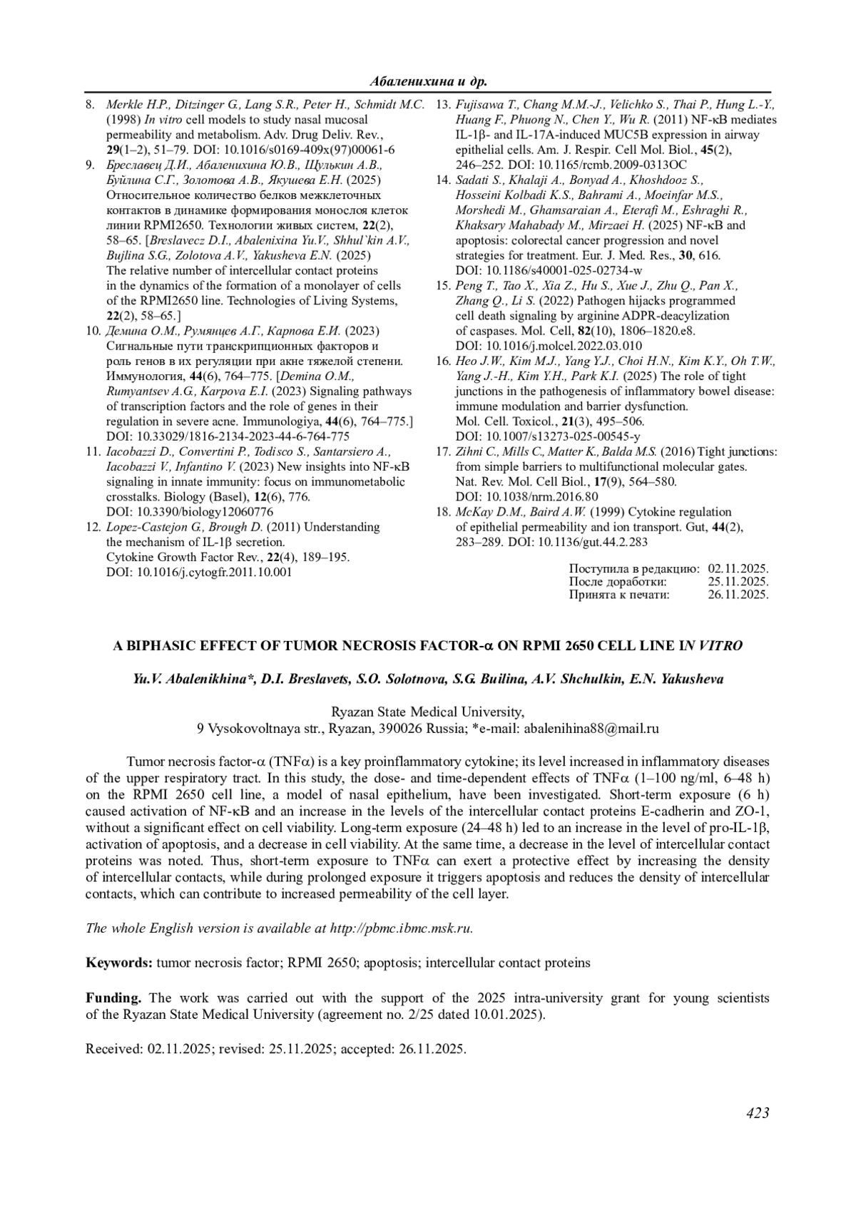 9. Бреславец Д.И., Абаленихина Ю.В., Щулькин А.В., Буйлина С.Г., Золотова А.В., Якушева Е.Н. (2025) Относительное количество белков межклеточных контактов в динамике формирования монослоя клеток линии RPMI2650. Технологии живых систем, 22(2), 58-65.