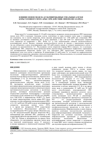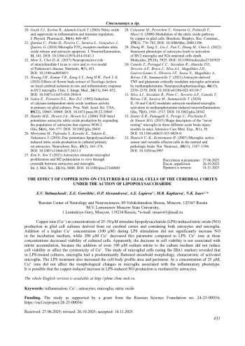 14. Stelmashook E.V., Alexandrova O.P., Genrikhs E.E., Novikova S.V., Salmina A.B., Isaev N.K. (2022) Effect of zinc and copper ions on cadmium-induced toxicity in rat cultured cortical neurons. J. Trace Elem. Med. Biol., 73, 27012. DOI: 10.1016/j.jtemb.2022.127012
