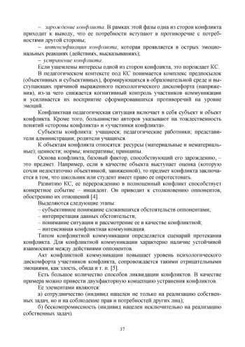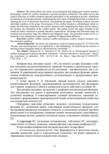 Статья отражает результаты психолого-педагогического исследования, ориентированного на разработку модели разрешения конфликтных ситуаций в общеобразовательных организациях. Обосновываются созидательные функции конфликтной ситуации между участниками педагогического процесса: стимулирование раскрытия потенциала личности; установление основной причины разногласий и ее искоренение; снижение уровня эмоционального дискомфорта; консолидация группы; развитие контактов между отдельными членами группы. Рассматривается структура конфликтной ситуации, включающая в себя компоненты: собственно конфликтная ситуация, интегрирующая в себе объект и субъект; инцидент; взаимодействие участников конфликта. Аргументируются этапы, включенные в модель разрешения конфликтных ситуаций в общеобразовательной организации: проектировочно-функциональная стадия, сущностно-процессуальная стадия, результативно-диагностическая стадия. Представленная модель может воспроизводиться в любой образовательной организации независимо от ведомственной принадлежности.