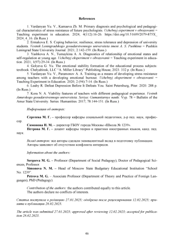 7. Кора Н. А. Особенности жизнестойкости педагогов с разным стажем педагогической деятельности // Вестник Амурского государственного университета. Серия: Гуманитарные науки. Вып. 78. 2017. С. 144-151. EDN: ZNHVBR