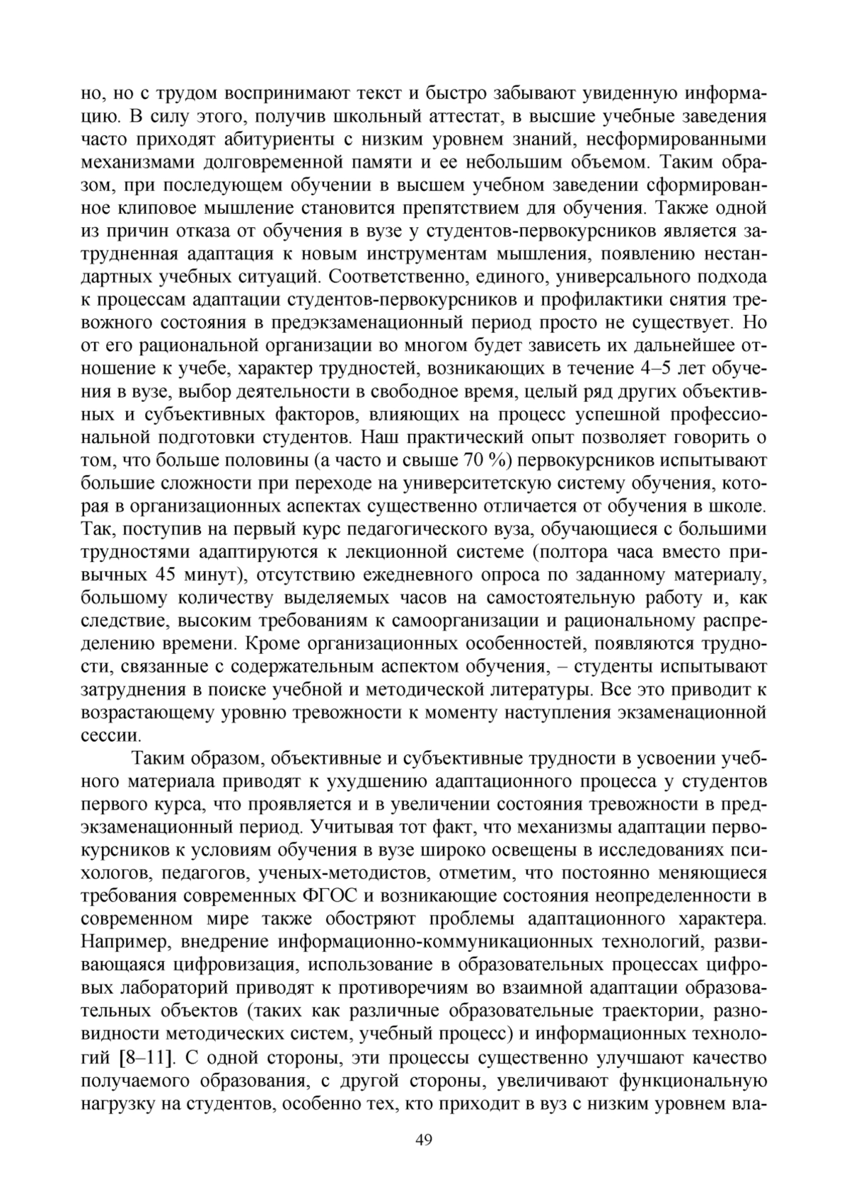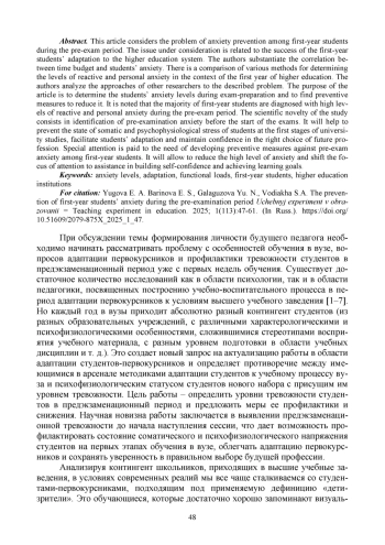 3. Говорушенко А. В. Академическая адаптация студентов-первокурсников к обучению в вузе // Гуманитарные исследования. Педагогика и психология. 2021. № 6. С. 16-21. EDN: YOLLQV