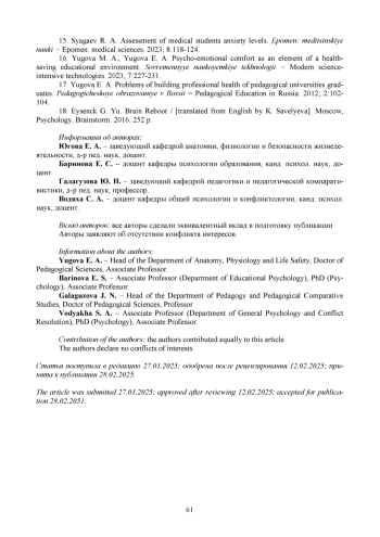 17. Югова Е. А. Проблемы формирования профессионального здоровья выпускников педагогических вузов // Педагогическое образование в России. 2012. № 2. С. 102-104.
