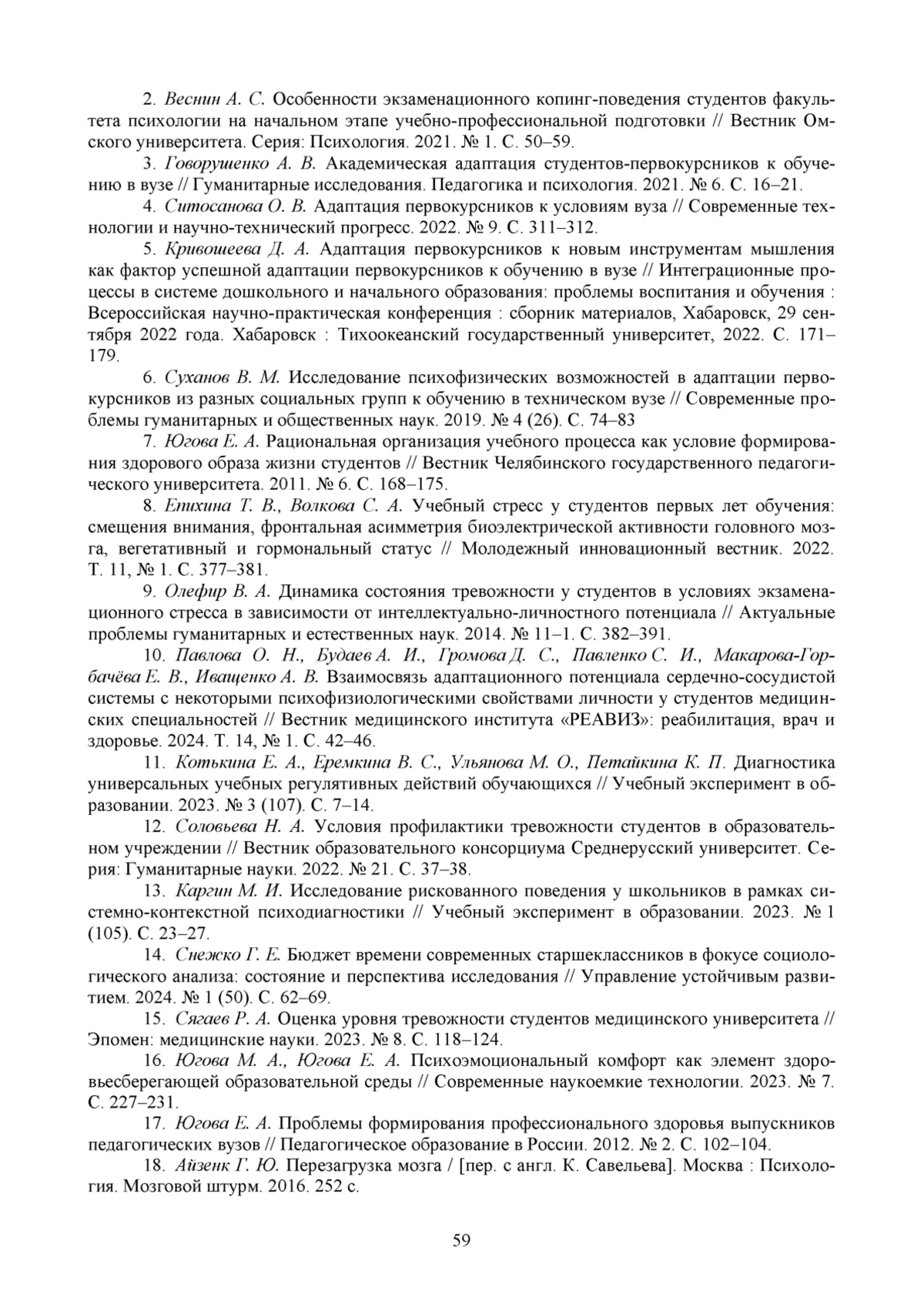 16. Югова М. А., Югова Е. А. Психоэмоциональный комфорт как элемент здоровьесберегающей образовательной среды // Современные наукоемкие технологии. 2023. № 7. С. 227-231. EDN: JVRXHN