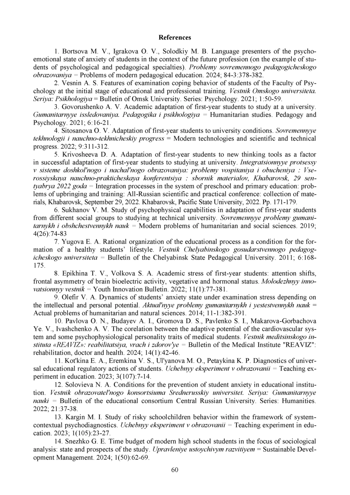 1. Борцова М. В., Игракова О. В., Солодкий М. Б. Языковые презентанты психоэмоционального состояния тревожности студентов в контексте будущей профессии (на примере студентов психолого-педагогических специальностей) // Проблемы современного педагогического образования. 2024. № 84-3. С. 378-382. EDN: LXBFUX