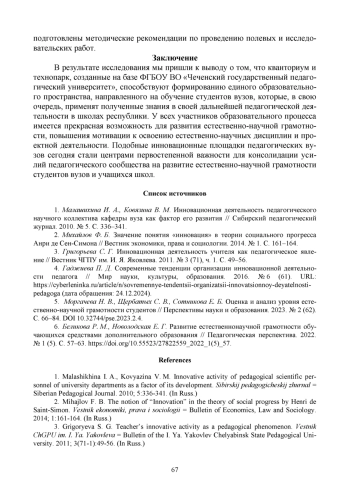 6. Беликова Р. М., Новолодская Е. Г. Развитие естественнонаучной грамотности обучающихся средствами дополнительного образования // Педагогическая перспектива. 2022. № 1 (5). С. 57-63. DOI: 10.55523/27822559_2022_1(5)_57 EDN: BOPQNE
