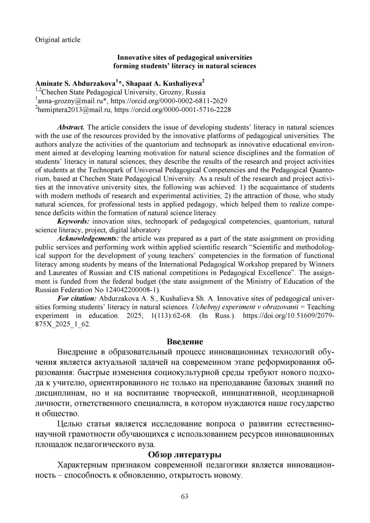 Статья посвящена изучению вопроса развития естественно-научной грамотности обучающихся с использованием ресурсов инновационных площадок педагогического вуза. Авторами проанализирована деятельность кванториума и технопарка как инновационной образовательной среды, направленной на развитие мотивации к обучению дисциплин естественно-научного профиля, формирование естественно-научной грамотности обучающихся; описаны результаты научно-исследовательской и проектной деятельности обучающихся в рамках работы технопарка универсальных педагогических компетенций и педагогического кванториума на базе Чеченского государственного педагогического университета. В результате осуществления исследовательской и проектной деятельности на инновационных площадках вуза было достигнуто: 1) знакомство обучающихся с современными методами исследовательской и экспериментальной деятельности; 2) привлечение студентов естественно-научных профилей для профессиональных проб в области прикладной педагогики, что способствовало осознанию ими своих компетентностных дефицитов в формировании естественно-научной грамотности.
