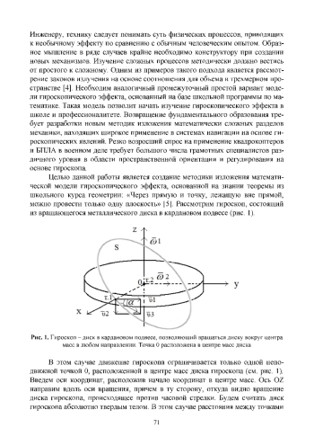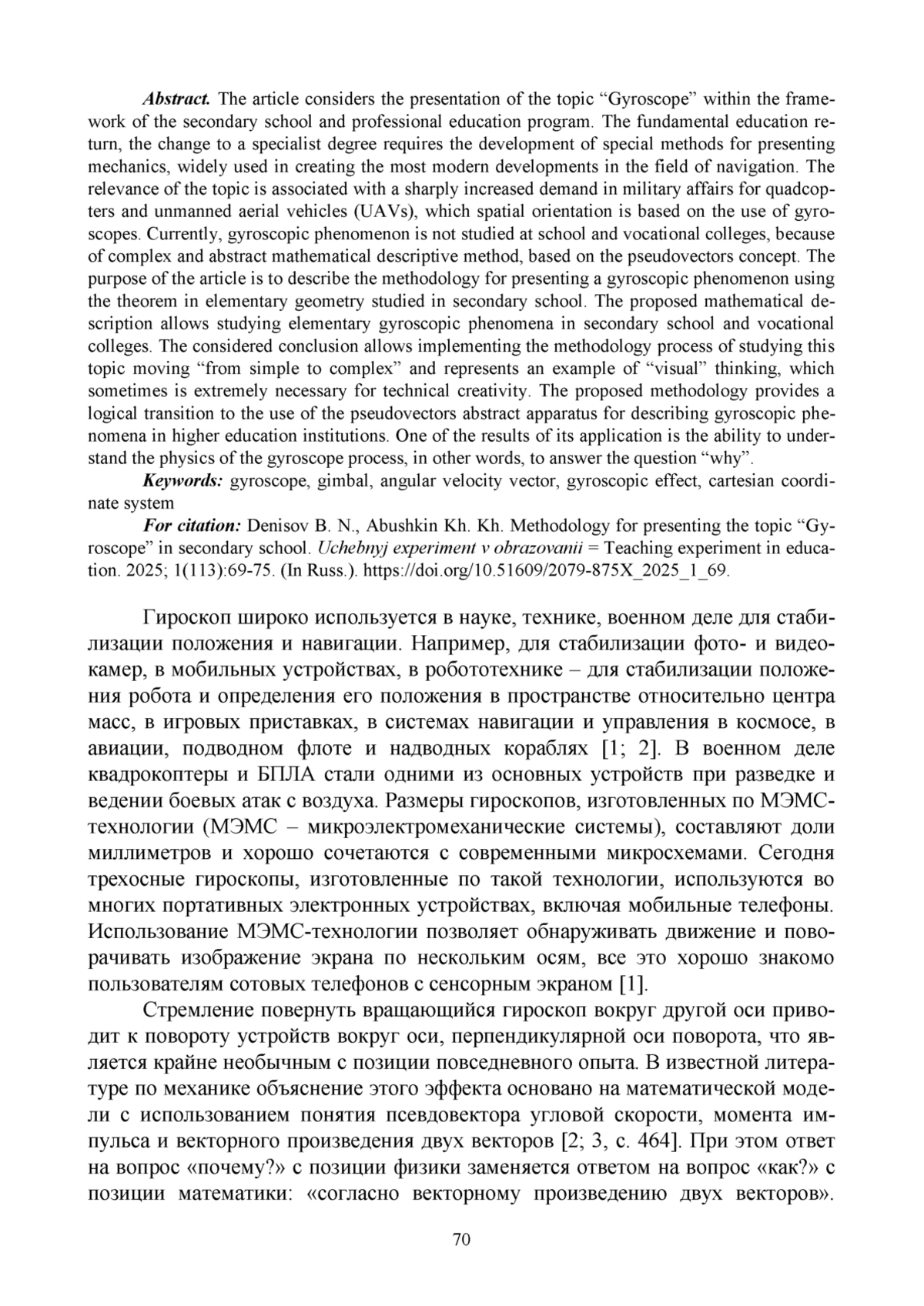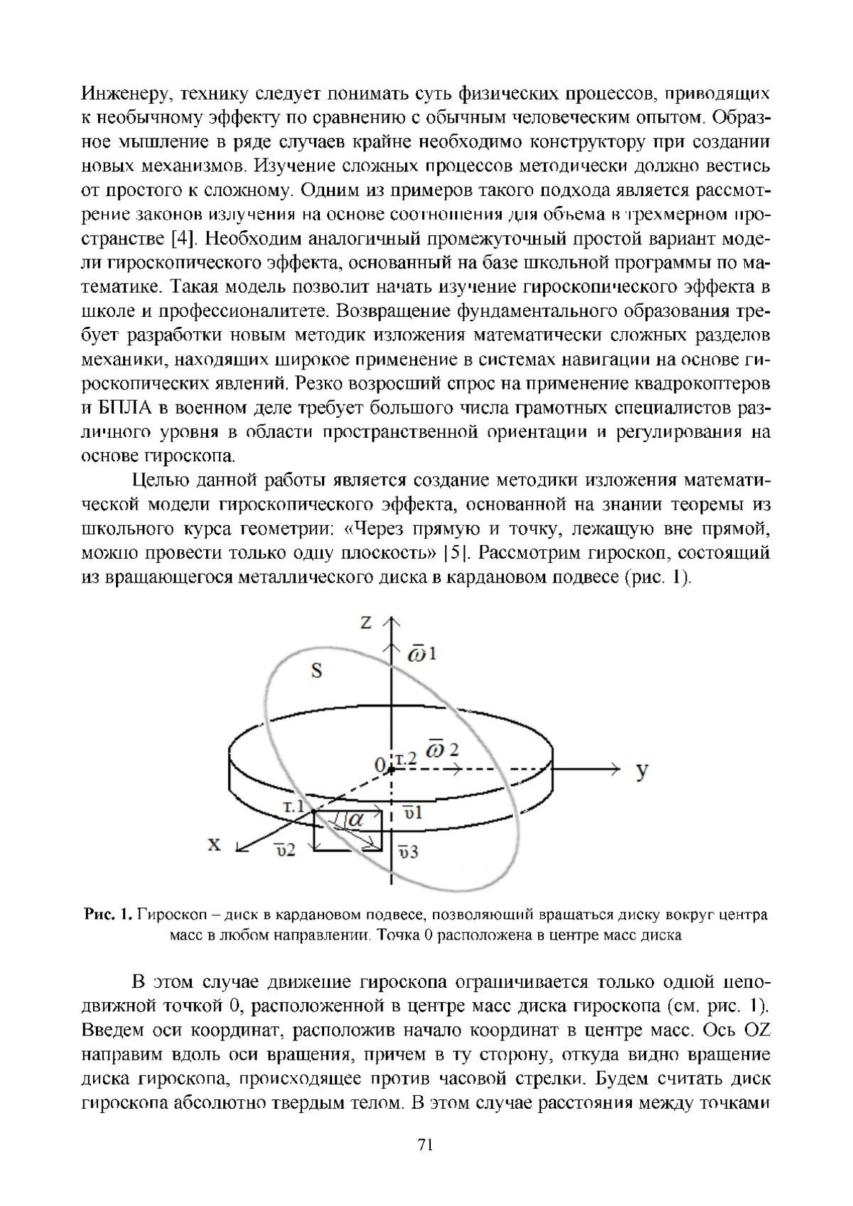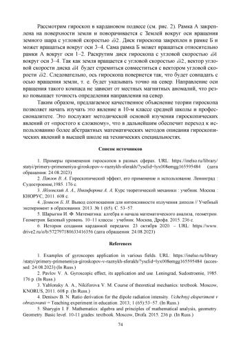Статья посвящена изложению темы «Гироскоп» в рамках программы средней школы и профессионалитета. Возвращение фундаментального образования, переход на специалитет требуют разработки специальных методик изложения некоторых разделов механики, широко используемых при создании самых современных разработок в области навигации. Актуальность темы связана с резко возросшим в военном деле спросом на применение квадрокоптеров и беспилотных летательных аппаратов (БПЛА), пространственная ориентация которых основана на применении гироскопов. В настоящее время гироскопические явление не изучается в школе и профессионалитете ввиду крайне сложного и абстрактного математического метода описания, основанного на понятии псевдовекторов. Целью статьи является описание методики изложения гироскопического явления с использованием теоремы элементарной геометрии, изучаемой в средней школе. Предлагаемое математическое описание позволяет начать изучать элементарные гироскопические явления в средней школе и в профессионалитете. Рассмотренный вывод позволяет реализовать процесс методики изучения данной темы «от простого к сложному» и представляет пример использования образного мышления, которое в ряде случаев крайне необходимо для технического творчества. Предложенная методика изложения в дальнейшем обеспечивает логический переход к использованию абстрактного аппарата псевдовекторов для описания гироскопических явлений в высшей школе. Одним из результатов ее применения является возможность понять физику процесса гироскопа, т. е. ответить на вопрос «почему?».