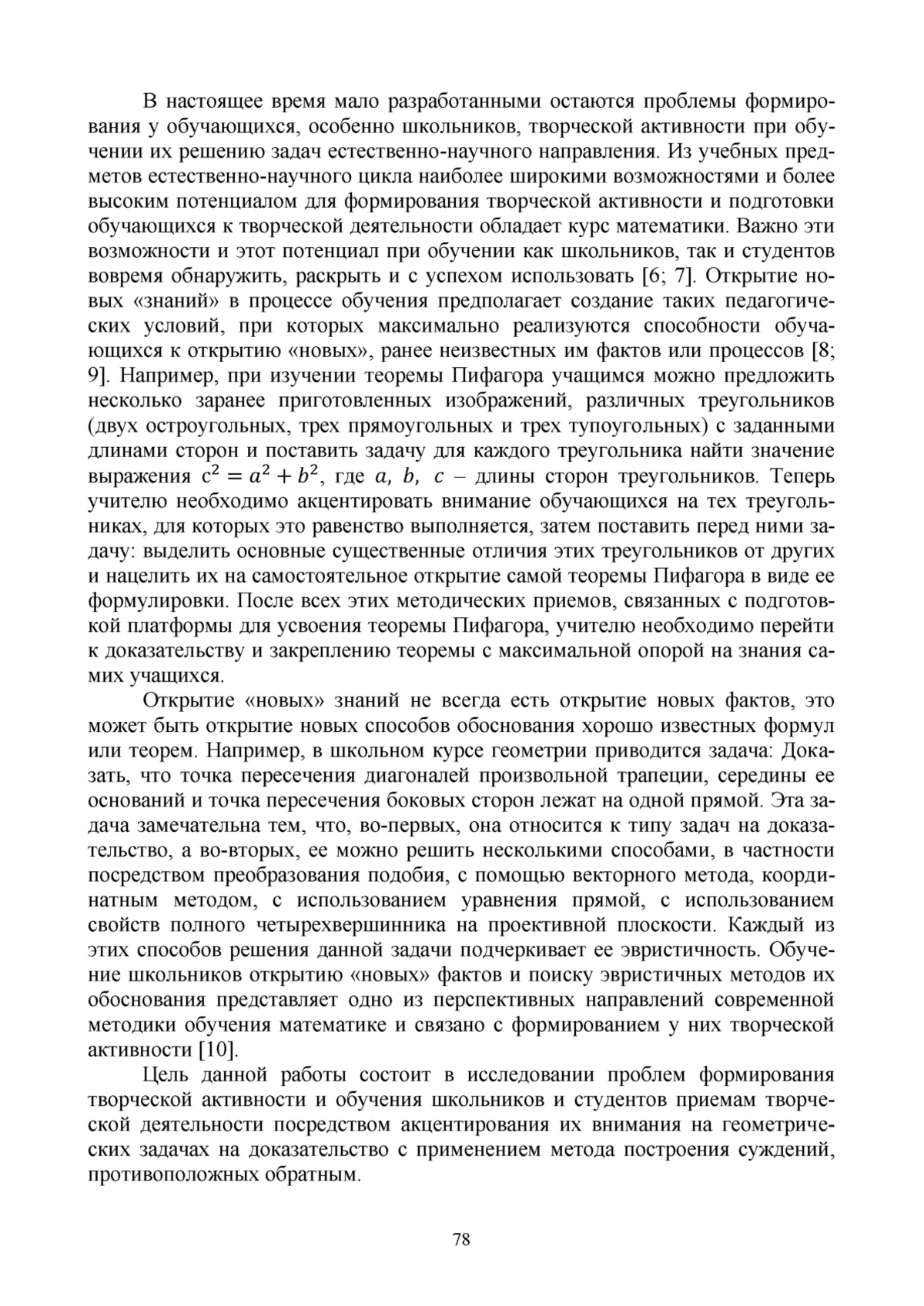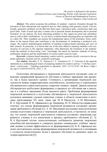 В частности, показано, что одним из наиболее эффективных методов обучения доказательству служит построение суждений, противоположных обратным, которое обусловливает формирование в сознании обучающихся приемов открытия «новых» для них знаний, поиск эвристических методов разрешения проблемных ситуаций, проявление различных видов творческой деятельности.