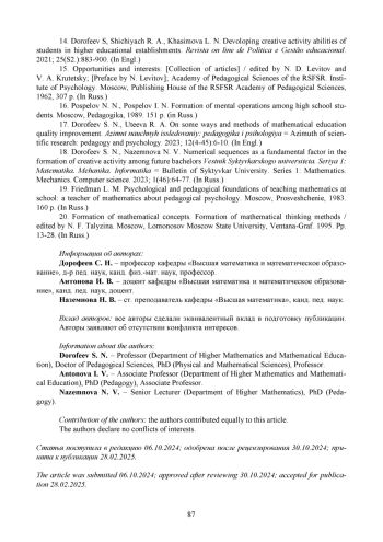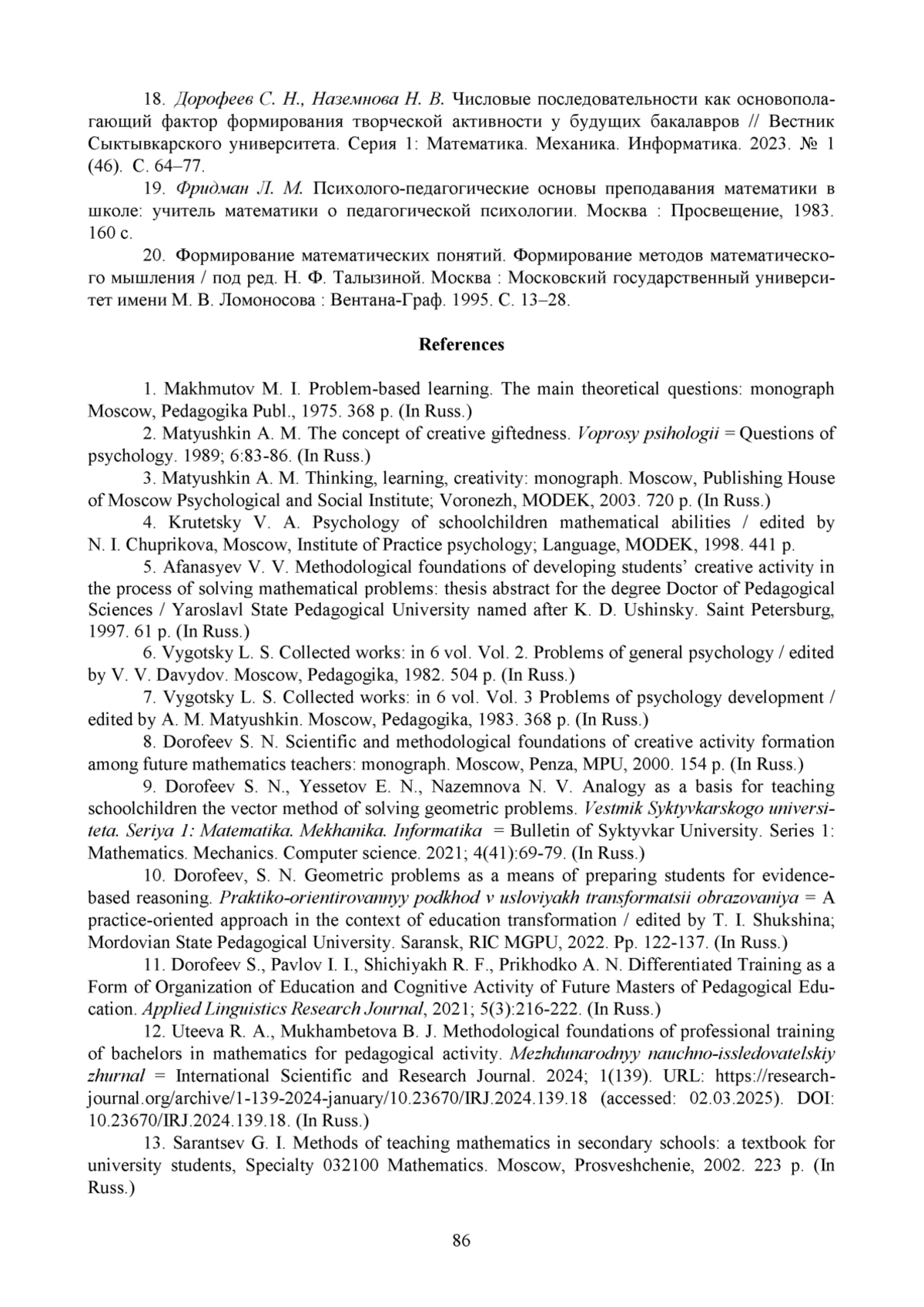 18. Дорофеев С. Н., Наземнова Н. В. Числовые последовательности как основополагающий фактор формирования творческой активности у будущих бакалавров // Вестник Сыктывкарского университета. Серия 1: Математика. Механика. Информатика. 2023. № 1 (46). С. 64-77. EDN: GLALCB