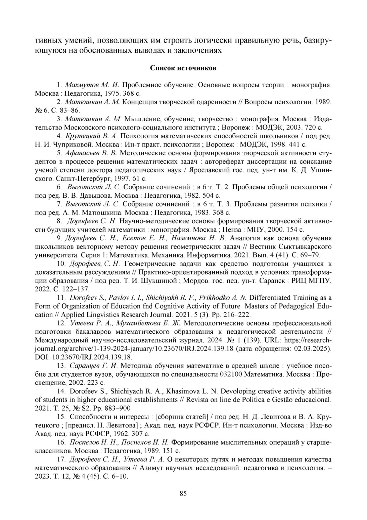 8. Дорофеев С. Н. Научно-методические основы формирования творческой активности будущих учителей математики: монография. Москва; Пенза: МПУ, 2000. 154 с.