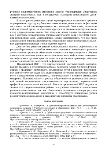 1. Архипова С. В., Нестерова Т. А. Диагностика развития связной речи детей старшего дошкольного возраста // Учебный эксперимент в образовании. 2024. № 3 (111). С. 17-28. DOI: 10.51609/2079-875X_2024_3_17 EDN: VBFOBV