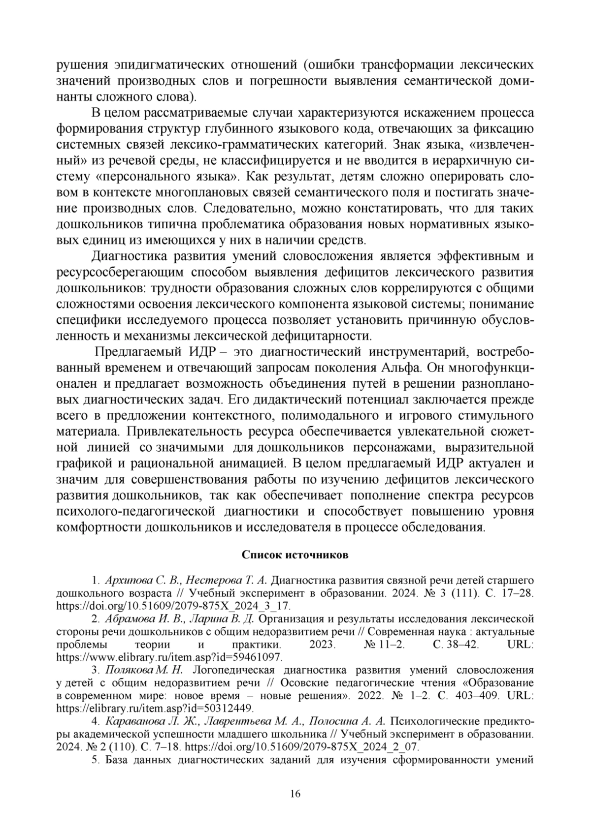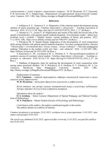 3. Полякова М. Н. Логопедическая диагностика развития умений словосложения у детей с общим недоразвитием речи // Осовские педагогические чтения “Образование в современном мире: новое время - новые решения”. 2022. № 1-2. С. 403-409. URL: item.asp?id=50312449. EDN: SJOMXW