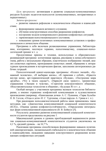 Социально-коммуникативная компетентность является значимой психологической характеристикой профессиональной подготовки студентов вуза. Актуальным вопросом выступает роль успешного развития коммуникативной компетентности студентов при реализации социально-образовательных событий и решении профессиональных задач. В статье изложено описание спроектированной и апробированной программы «Эффекты общения», направленной на активизацию и развитие социально-коммуникативных ресурсов будущих педагогов-психологов, подчеркнуты позитивные изменения в формирование социально-коммуникативной компетентности, также в ней представлены психолого-педагогические рекомендации по развитию социально-коммуникативной компетентности студентов вуза.