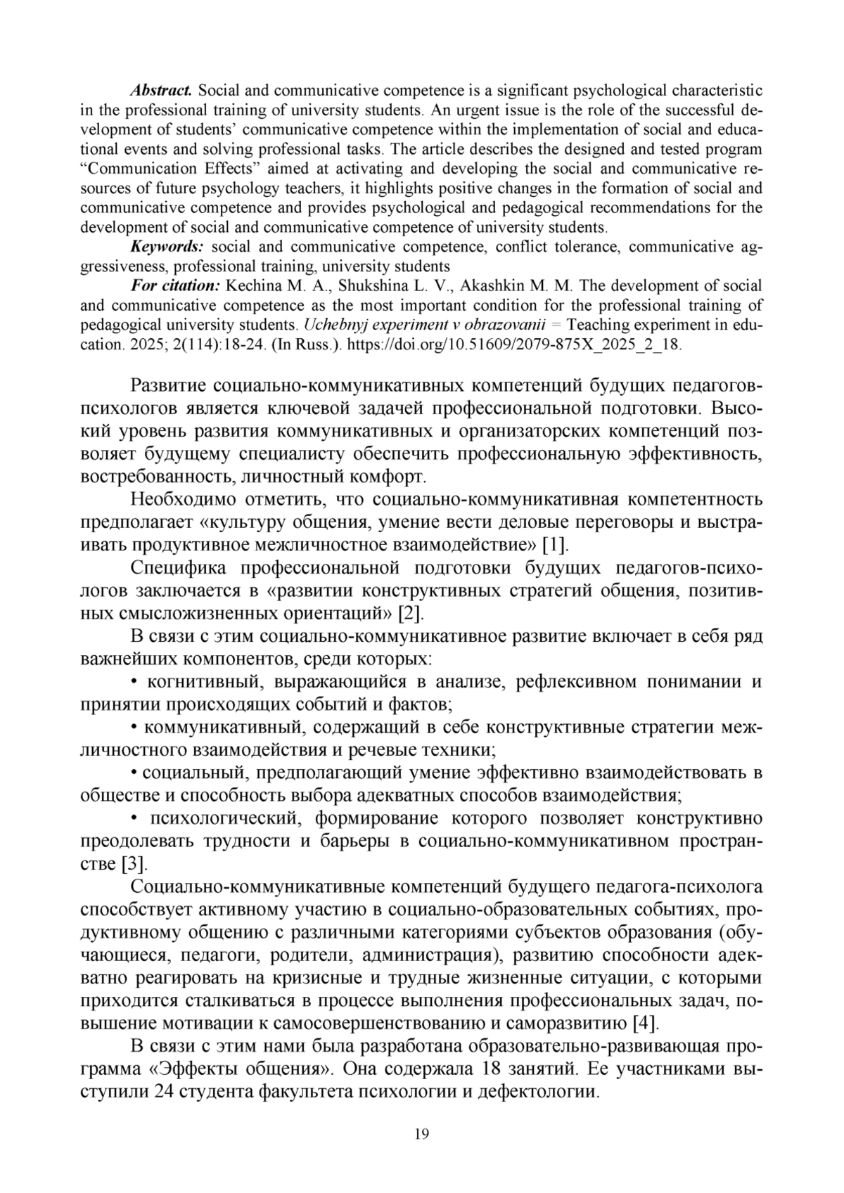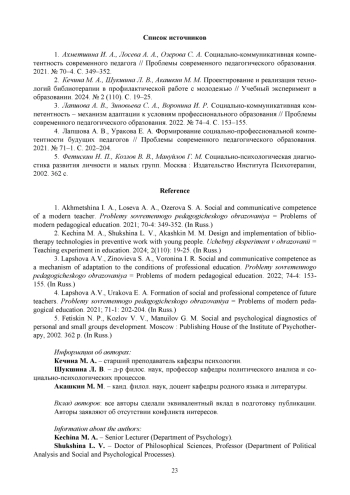 1. Ахметшина И. А., Лосева А. А., Озерова С. А. Социально-коммуникативная компетентность современного педагога // Проблемы современного педагогического образования. 2021. № 70-4. С. 349-352. EDN: YGLFMC