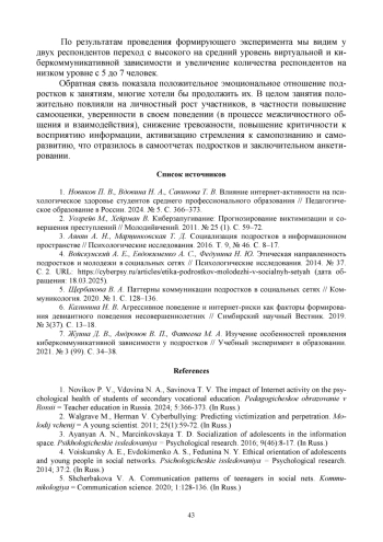 1. Новиков П. В., Вдовина Н. А., Савинова Т. В. Влияние интернет-активности на психологическое здоровье студентов среднего профессионального образования // Педагогическое образование в России. 2024. № 5. С. 366-373.