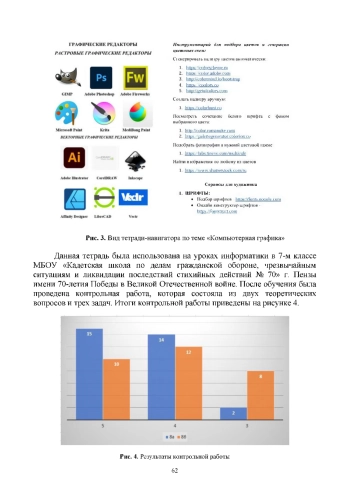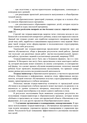 В данной статье авторы рассматривают возможности использования тетрадей-навигаторов при обучении предметной области «Математика и информатика». Под тетрадью-навигатором авторы понимают особый вид рабочей тетради, который используется в образовательном процессе для различных целей: для мотивации школьников к учебе, как тетрадь с образовательной траекторией для неуспевающих или, наоборот, с траекторией для одаренных детей, как вспомогательный раздел к уже имеющемуся материалу. Описывают основные возможные результаты использования тетрадей-навигаторов, наиболее эффективные способы взаимодействия педагога с обучающимися при использовании данных тетрадей. Также авторы описывают основные принципы и подходы к разработке тетрадей-навигаторов. В качестве примера авторы рассматривают тетрадь-навигатор по теме «Компьютерная графика».