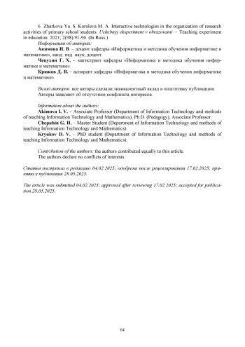 6. Жаркова Ю. С., Королев М. А. Интерактивные технологии в организации исследовательской деятельности учащихся основной школы // Учебный эксперимент в образовании. 2021. № 2 (98) С. 91-96. EDN: EOTTAK