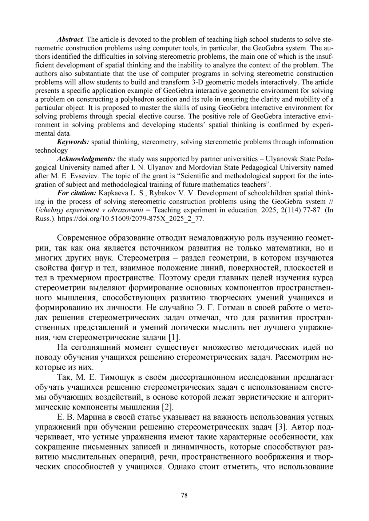 3. Марина Е. В. Использование устных упражнений при изучении стереометрии в средней школе // Психология и педагогика: методика и проблемы практического применения: сборник научных статей по материалам XXVI Международной научно-практической конференции. Новосибирск: Новосибирский государственный технический университет, 2019. С. 255-261.