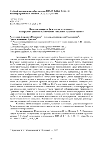 Формирование исследовательских компетенций в курсе физики в медицинском вузе - важная составляющая начального этапа профессиональной под готовки врача-клинициста [1]. Способность интерпретировать эмпирические данные в контексте биологических, физических и методологических факторов лежит в основе современной доказательной практики. Уже на ранних этапах профессионального становления студент должен понимать, что экспериментальные результаты не сводятся к механической регистрации чисел: каждый измеренный параметр отражает совокупное влияние структуры исследуемого объекта, свойств измерительной системы и условий проведения опыта. Это требует развития критического мышления и понимания ограничений применяемых моделей [2].