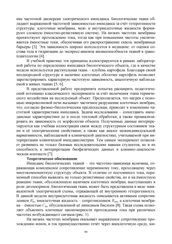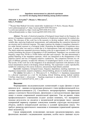 Изучение электрических свойств биологических тканей на основе частотной дисперсии импеданса представляет собой перспективное направление учебных биофизических экспериментов в медицинском вузе. Актуальность данной работы обусловлена необходимостью формирования у студентов навыков интерпретации вариативных данных, критического анализа биофизических измерений и понимания связи между структурным состоянием ткани и её электрическим откликом. Исследуются изменения импедансных характеристик при тепловом воздействии на биологический объект, направленные на иллюстрацию деградации мембранных структур. В качестве модели использовался клубень картофеля, обладающий неоднородной водной и мембранной структурой. Объект подвергался последовательным циклам нагрева в микроволновой печи до температуры около 60 °С с последующим охлаждением (имитация процесса деградации клеточных мембран). Импеданс регистрировался в диапазоне частот от 500 Гц до 20 кГц до и после каждого воздействия. Полученные данные показали постепенное сглаживание спектра импеданса, что интерпретируется как исчезновение ёмкостного барьера и утрата частотной избирательности проводимости. Сравнение двух объектов с различной геометрией позволило продемонстрировать влияние морфологических факторов на форму кривой. Новизна работы заключается в сочетании учебного эксперимента с элементами исследовательской интерпретации, направленной на развитие клинического мышления. Эксперимент легко воспроизводим, доступен для внедрения в курс физики и обладает высоким дидактическим потенциалом.