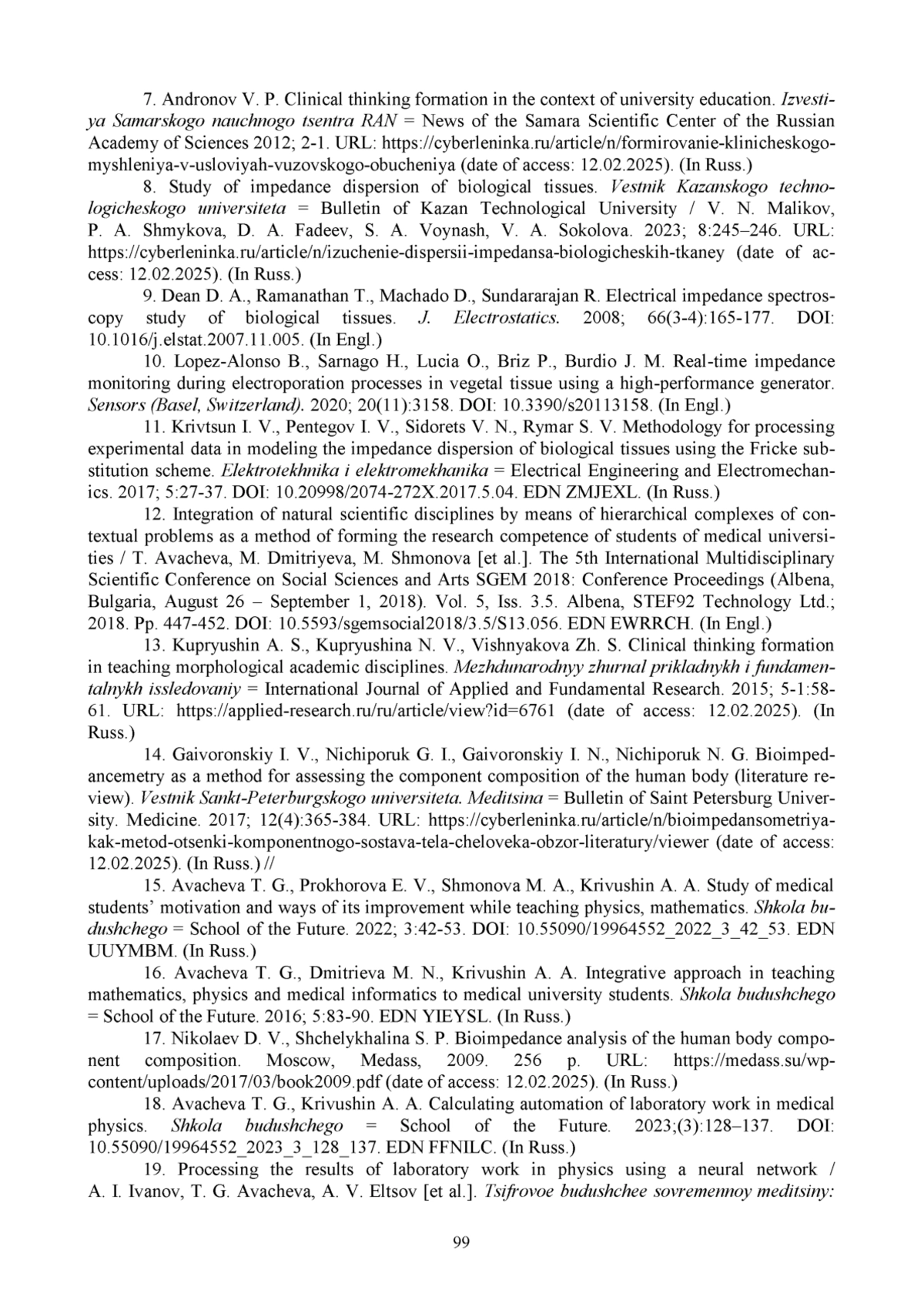 5. Ененков Н. В., Авачева Т. Г. Новые подходы к преподаванию физики в медицинском вузе на примере определения импеданса биологического объекта // Актуальные проблемы физики и технологии в образовании, науке и производстве: материалы IV Всероссийской научно-практической конференции, посвященной 120-летию Александра Васильевича Пёрышкина, Рязань, 24-25 марта 2022 года / под редакцией В. А. Степанова, О. В. Кузнецовой. Рязань: Рязанский государственный университет имени С. А. Есенина, 2022. С. 186-188. EDN: HPGXLI