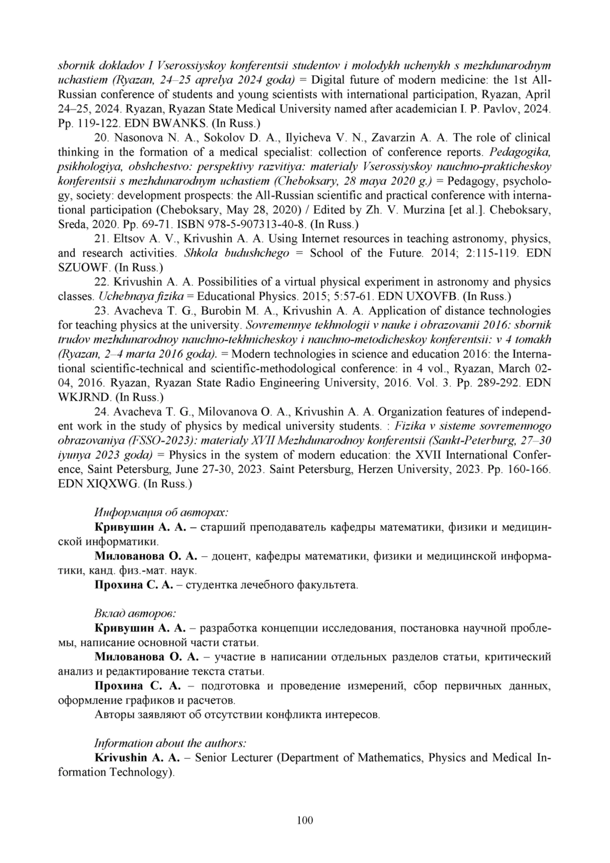24. Авачева Т. Г., Милованова О. А., Кривушин А. А. Особенности организации самостоятельной работы при изучении физики студентов медицинского университета // Физика в системе современного образования (ФССО-2023): материалы XVII Международной конференции, Санкт-Петербург, 27-30 июня 2023 года. Санкт-Петербург: Российский государственный педагогический университет им. А. И. Герцена, 2023. С. 160-166. EDN: XIQXWG